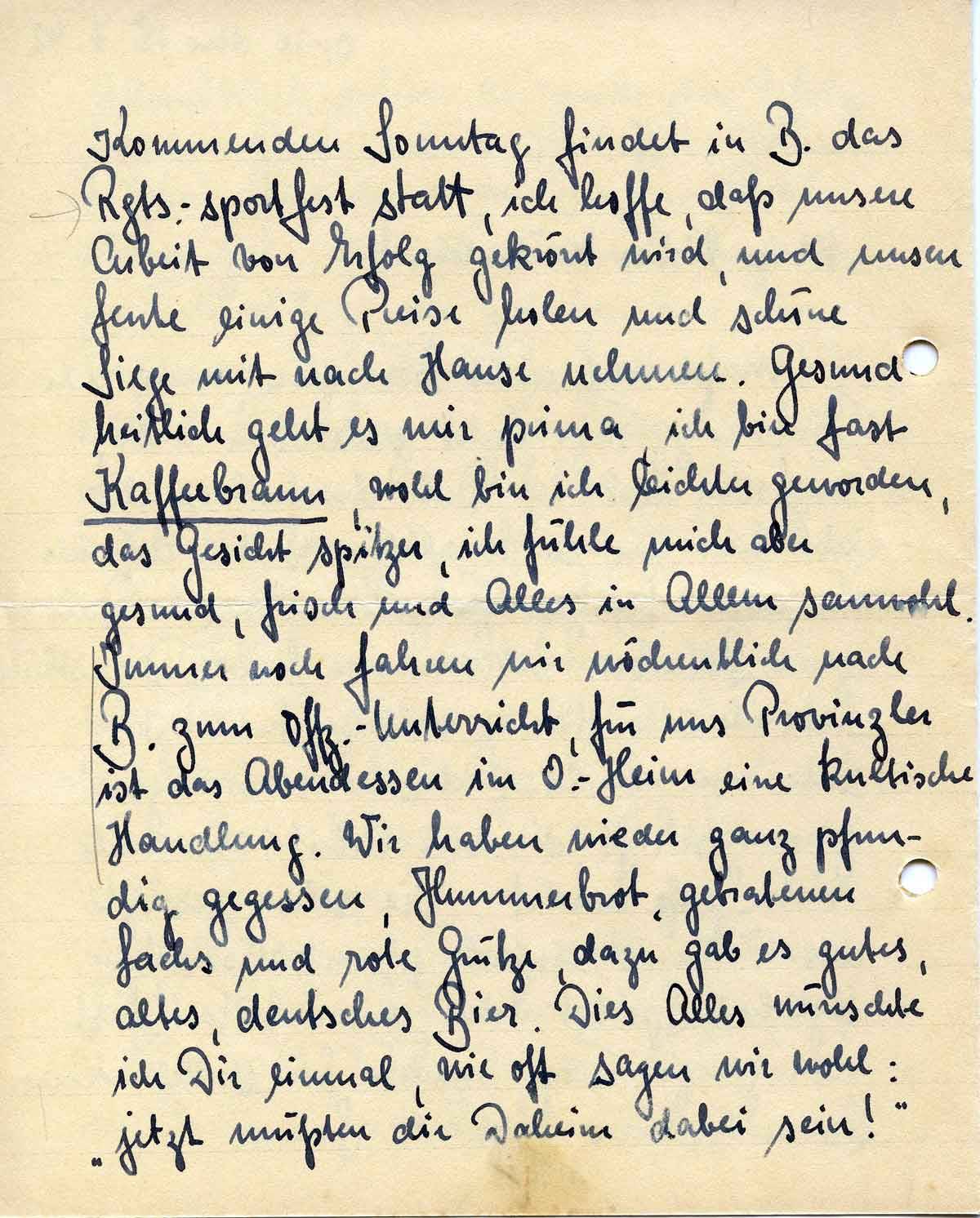 Kommenden Sonntag findet in B. das Regts.-sportfest statt, ich hoffe, daß unsere Arbeit von Erfolg gekrönt wird, und unsere Leute einige Preise holen und schöne Siege mit nach Hause nehmen. Gesundheitlich geht es mir prima, ich bin fast Kaffeebraun, wohl bin ich leichter geworden, das Gesicht spitzer, ich fühle mich aber gesund, frisch und Alles in Allem sauwohl. Immer noch fahren wir wöchentlich nach B. zum Offz.-Unterricht, für uns Provinzler ist das Abendessen im O.-Heim eine kultische Handlung. Wir haben wieder ganz pfundig gegessen, Hummerbrot, gebratenen Lachs und rote Grütze, dazu gab es gutes, altes, deutsches Bier. Dies Alles wünschte ich Dir einmal, wie oft sagen wir wohl: „jetzt müßten die Daheim dabei sein!“