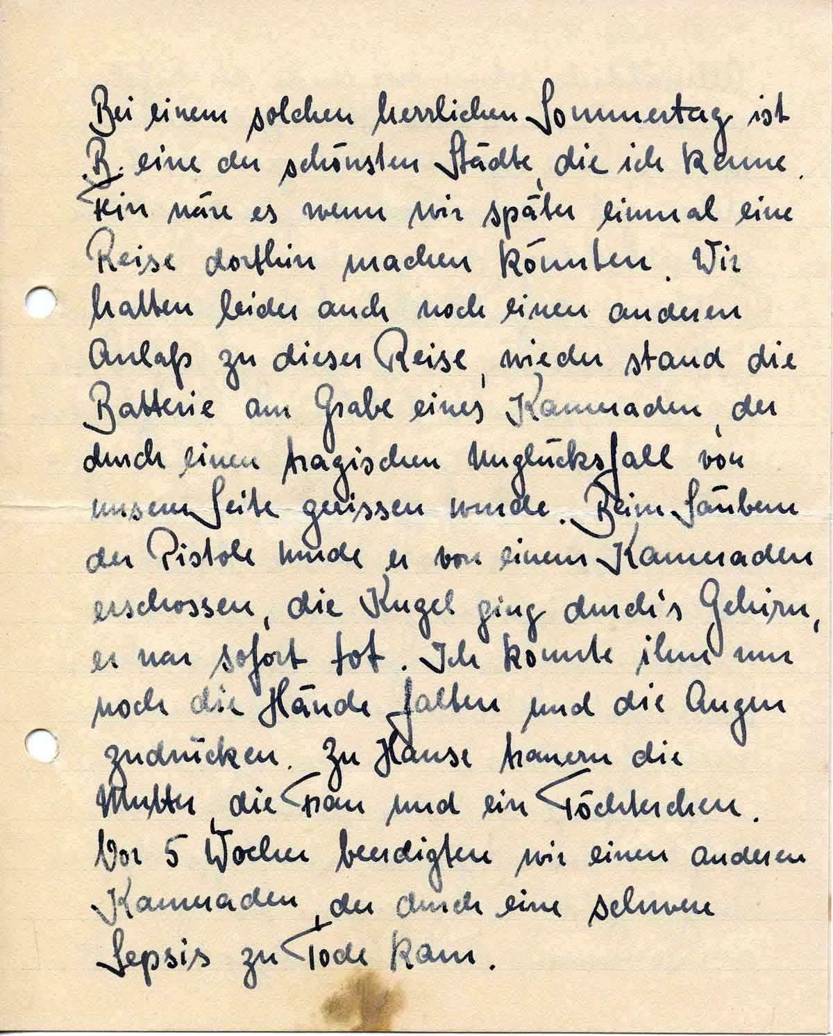 Bei einem solchen herrlichen Sonnentag ist B. eine der schönsten Städte, die ich kenne. Fein wäre es wenn wir später einmal eine Reise dorthin machen könnten. Wir hatten leider auch noch einen anderen Anlaß zu dieser Reise, wieder stand die Batterie am Grabe eines Kameraden, der durch einen tragischen Unglücksfall von unserer Seite gerissen wurde. Beim Säubern der Pistole wurde er von einem Kameraden erschossen, die Kugel ging durch’s Gehirn, er war sofort tot. Ich konnte ihm nur noch die Hände halten und die Augen zudrücken. Zu Hause trauern die Mutter, die Frau und ein Töchterchen. Vor 5 Wochen beerdigten wir einen anderen Kameraden, der durch eine schwere Sepsis zu Tode kam.
