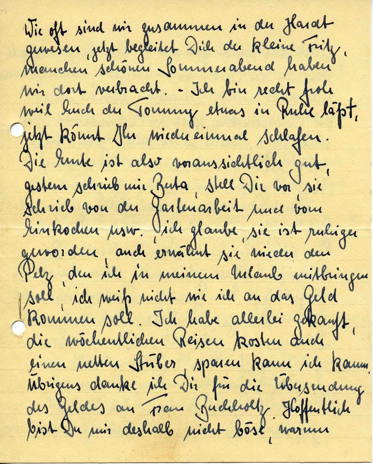 Wie oft sind wir zusammen in der Hardt gewesen, jetzt begleitet Dich der kleine Fritz, manchen schönen Sommerabend haben wir dort verbracht. – Ich bin recht froh weil Euch der Tommy etwas in Ruhe läßt, jetzt könnt Ihr wieder einmal schlafen. Die Ernte ist also voraussichtlich gut, gestern schrieb mir Berta, stell Dir vor, sie schrieb von der Gartenarbeit und vom Einkochen usw., ich glaube, sie ist ruhiger geworden, auch erwähnt sie wieder den Pelz, den ich in meinem Urlaub mitbringen soll, ich weiß nicht wie ich an das Geld kommen soll. Ich habe allerlei gekauft, die wöchentlichen Reisen kosten auch einen netten Stüber, sparen kann ich kaum. Übrigens danke ich Dir für die Übersendung des Geldes an Frau Buchholtz. Hoffentlich bist Du mir deshalb nicht böse, warum