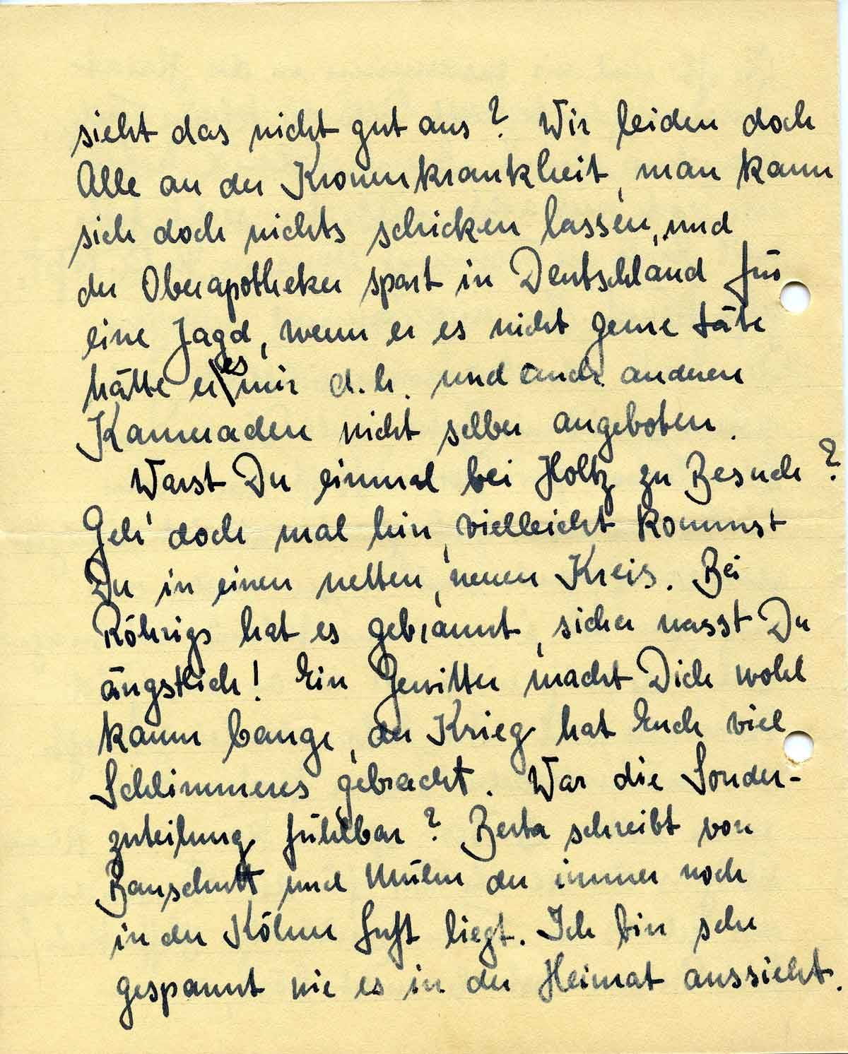 Warst Du einmal bei Holtz zu Besuch? Geh‘ doch mal hin, vielleicht kommst Du in einen netten, neuen Kreis. Bei Röhrigs hat es gebrannt, sicher warst Du ängstlich! Ein Gewitter macht Dich wohl kaum bange, der Krieg hat Euch viel Schlimmeres gebracht. War die Sonderzuteilung fühlbar? Berta schreibt von Bauschutt und Mühen der immer noch in der Kölner Luft liegt. Ich bin sehr gespannt wie es in der Heimat aussieht.