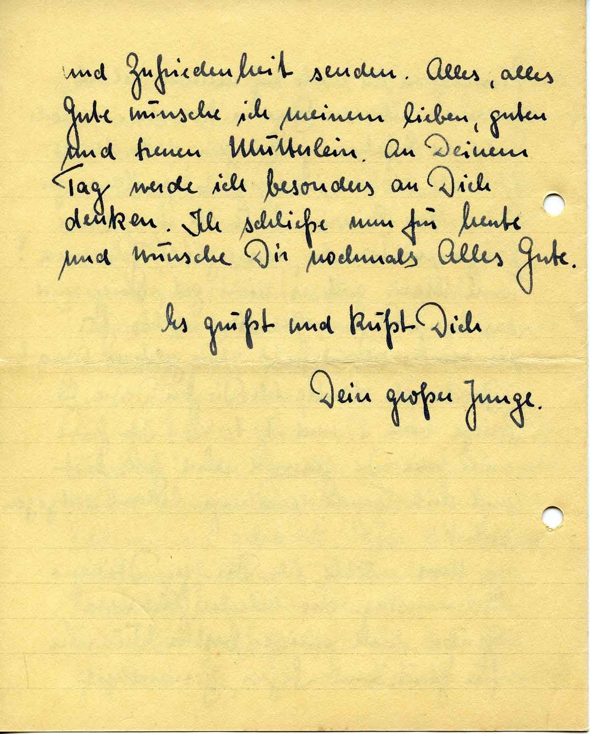 Riesig freue ich mich auf meinen Urlaub, Genaueres über den Beginn konnte ich noch nicht in Erfahrung bringen, doch denke ich nach wie vor im August zu Hause zu sein. Von Heinrich hörte ich nun schon länger nichts mehr, was erzählt Johanna? Tante Marie geht es nicht gut, Krieg und das lange Regenwetter sind nichts für die armen alten Leute. Wie geht es Oma?