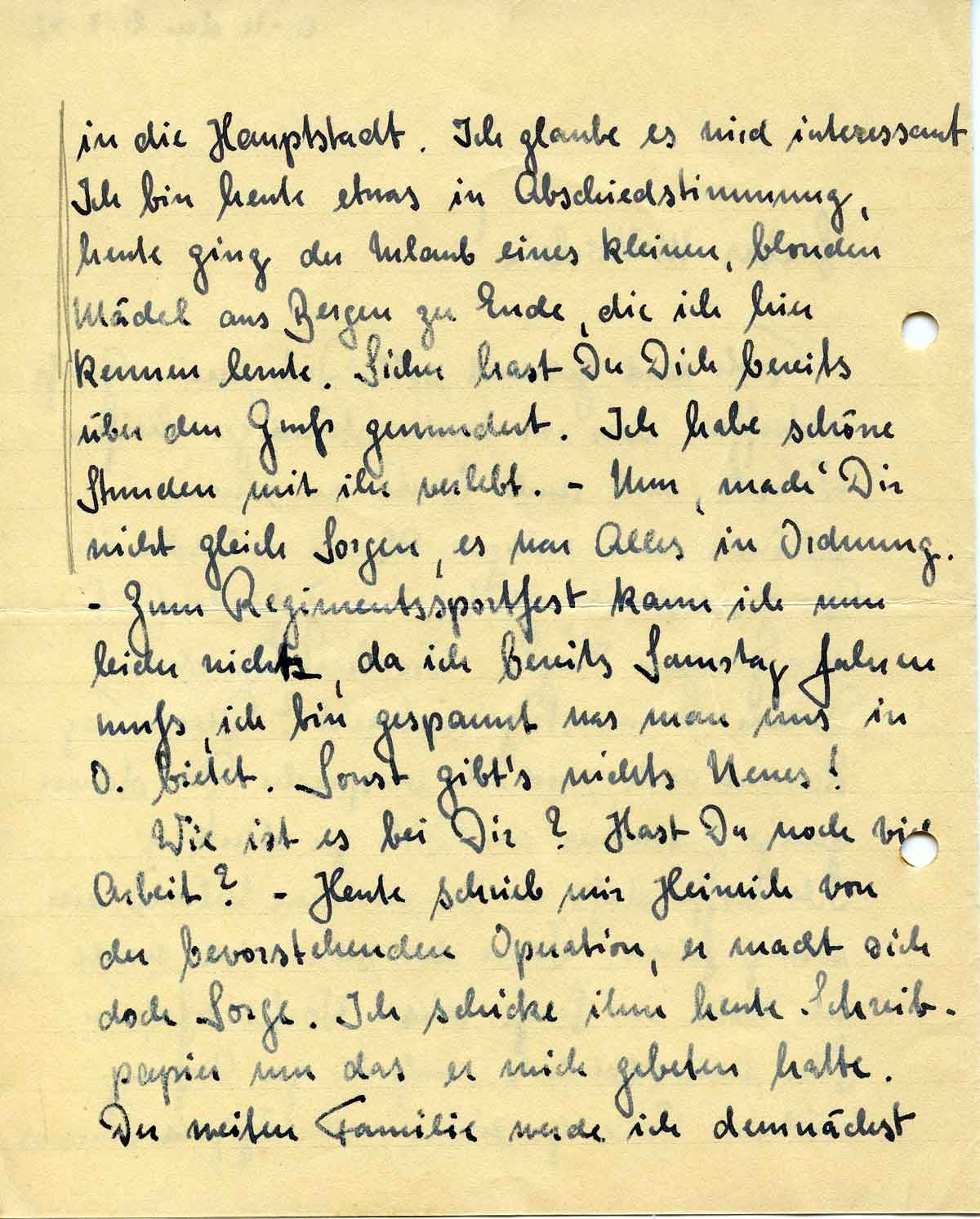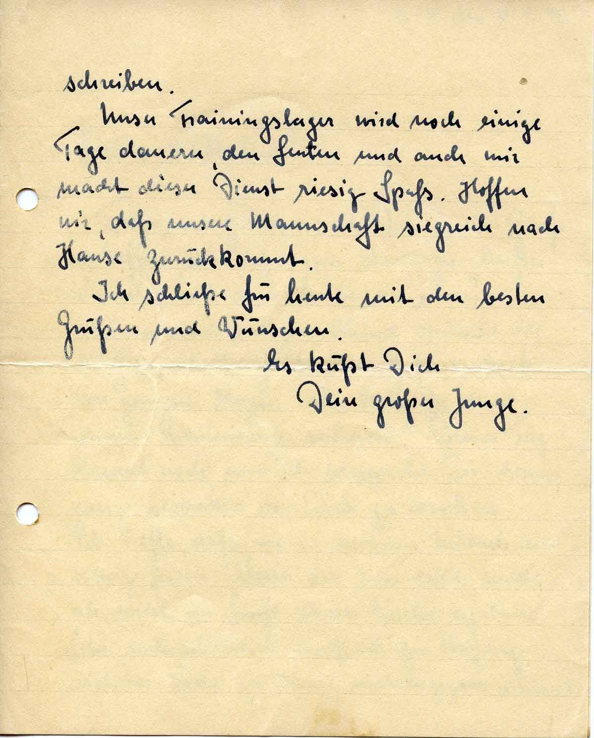 in die Hauptstadt. Ich glaube es wird interessant. Ich bin heute etwas in Abschiedsstimmung, heute ging der Urlaub eines kleinen, blonden Mädel aus Bergen zu Ende, die ich hier kennen lernte. Sicher hast Du Dich bereits über den Gruß gewundert. Ich habe schöne Stunden mit ihr verlebt. – Nun, mach‘ Dir nicht gleich Sorgen, es war Alles in Ordnung. – Zum Regimentssportfest kann ich nun leider nicht, da ich bereits Samstag fahren muß, ich bin gespannt was man uns in O. bietet. Sonst gibt’s nichts Neues!