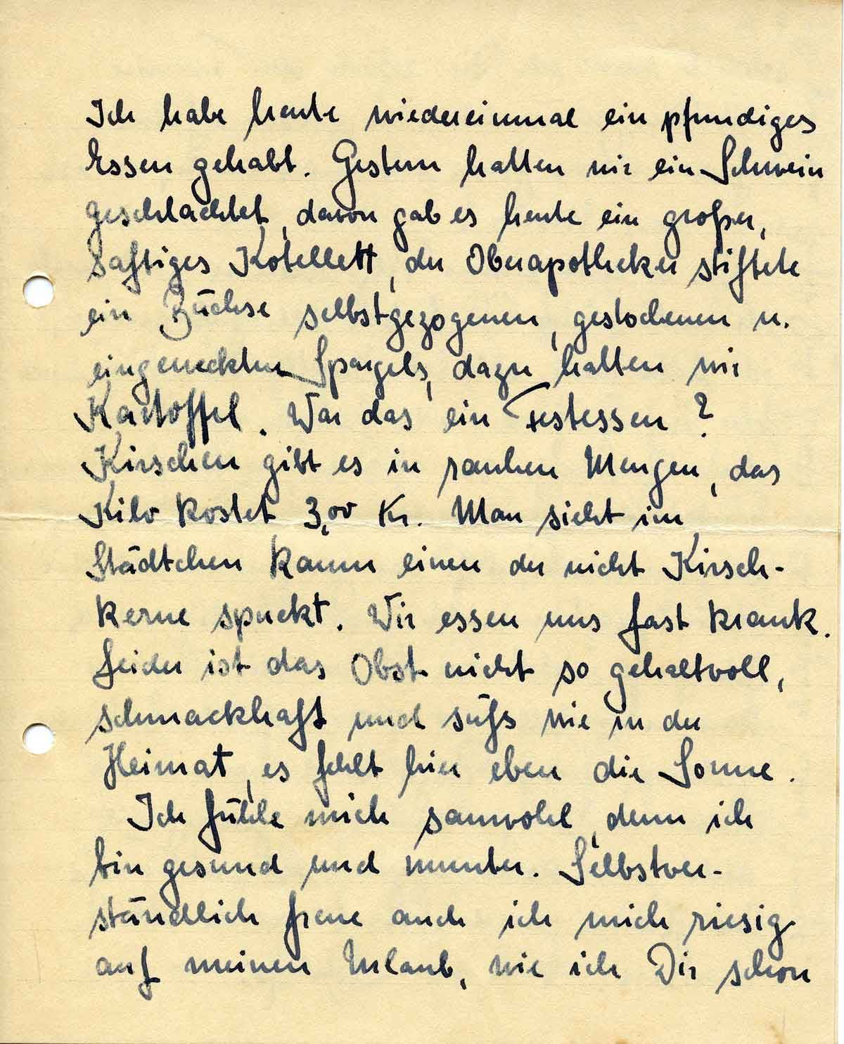 Ich habe heute wieder einmal ein pfundiges Essen gehabt. Gestern hatten wir ein Schwein geschlachtet, davon gab es heute ein großes, saftiges Kotellett, der Oberapotheker stiftete ein Büchse selbstgezogenen, gestochenen u. eingeweckten Spargels, dazu hatten wir Kartoffel. War das ein Festessen? Kirschen gibt es in rauhen Mengen, das Kilo kostet 3,00 Kr. Man sieht im Städtchen kaum einen der nicht Kirschkerne spuckt. Wir essen uns fast krank. Leider ist das Obst nicht so gehaltvoll, schmackhaft und süß wie in der Heimat, es fehlt hier eben die Sonne.
