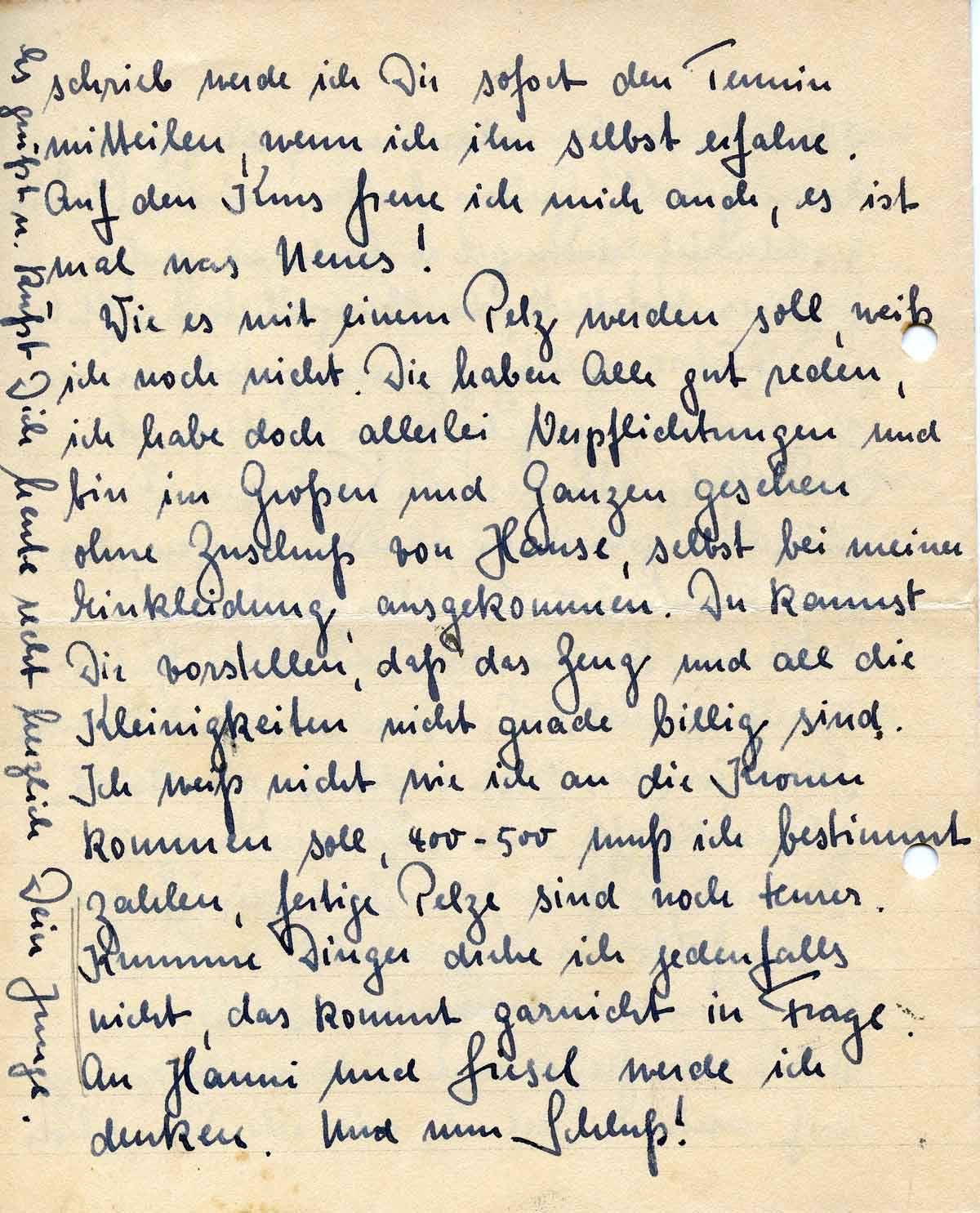 Wie es mit einem Pelz werden soll, weiß ich noch nicht. Die haben Alle gut reden, ich habe doch allerlei Verpflichtungen und bin im Großen und Ganzen gesehen ohne Zuschuß von Hause, selbst bei meiner Einkleidung, ausgekommen. Du kannst Dir vorstellen, daß das Zeug und all die Kleinigkeiten nicht gerade billig sind. Ich weiß nicht wie ich an die Kronen kommen soll, 400-500 muß ich bestimmt zahlen, fertige Pelze sind noch teurer. Krumme Dinger drehe ich jedenfalls nicht, das kommt garnicht in Frage. An Hanni und Liesel werde ich denken. Und nun Schluß!