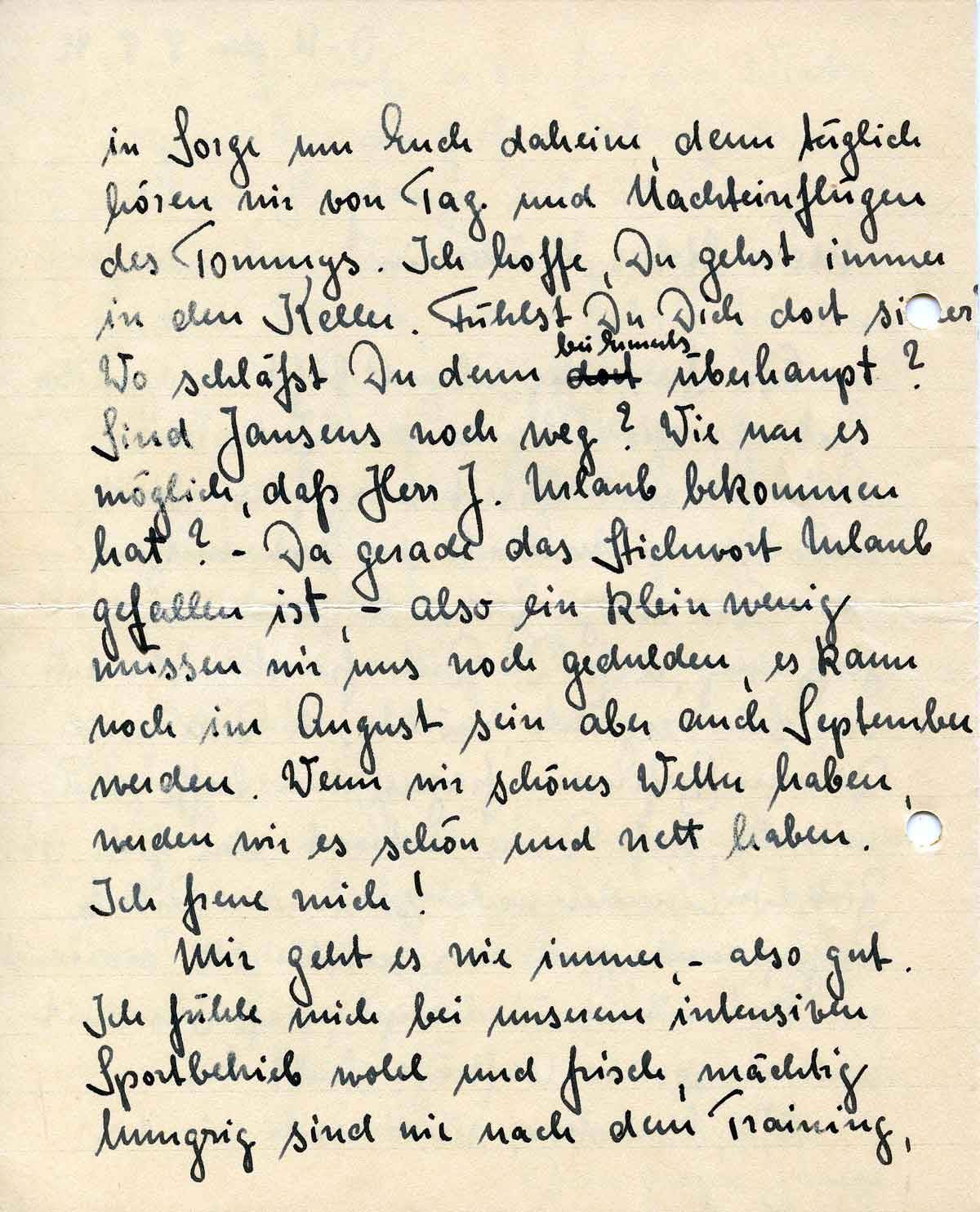 in Sorge um Euch daheim, denn täglich hören wir von Tag- und Nachteinflügen des Tommys. Ich hoffe, Du gehst immer in den Keller. Fühlst Du Dich dort sicher? Wo schläfst Du denn bei Ermerts überhaupt? Sind Jansens noch weg? Wie war es möglich, daß Herr J. Urlaub bekommen hat? – Da gerade das Stichwort Urlaub gefallen ist, - also ein klein wenig müssen wir uns noch gedulden, es kann noch im August sein aber auch September werden. Wenn wir schönes Wetter haben, werden wir es schön und nett haben. Ich freue mich!