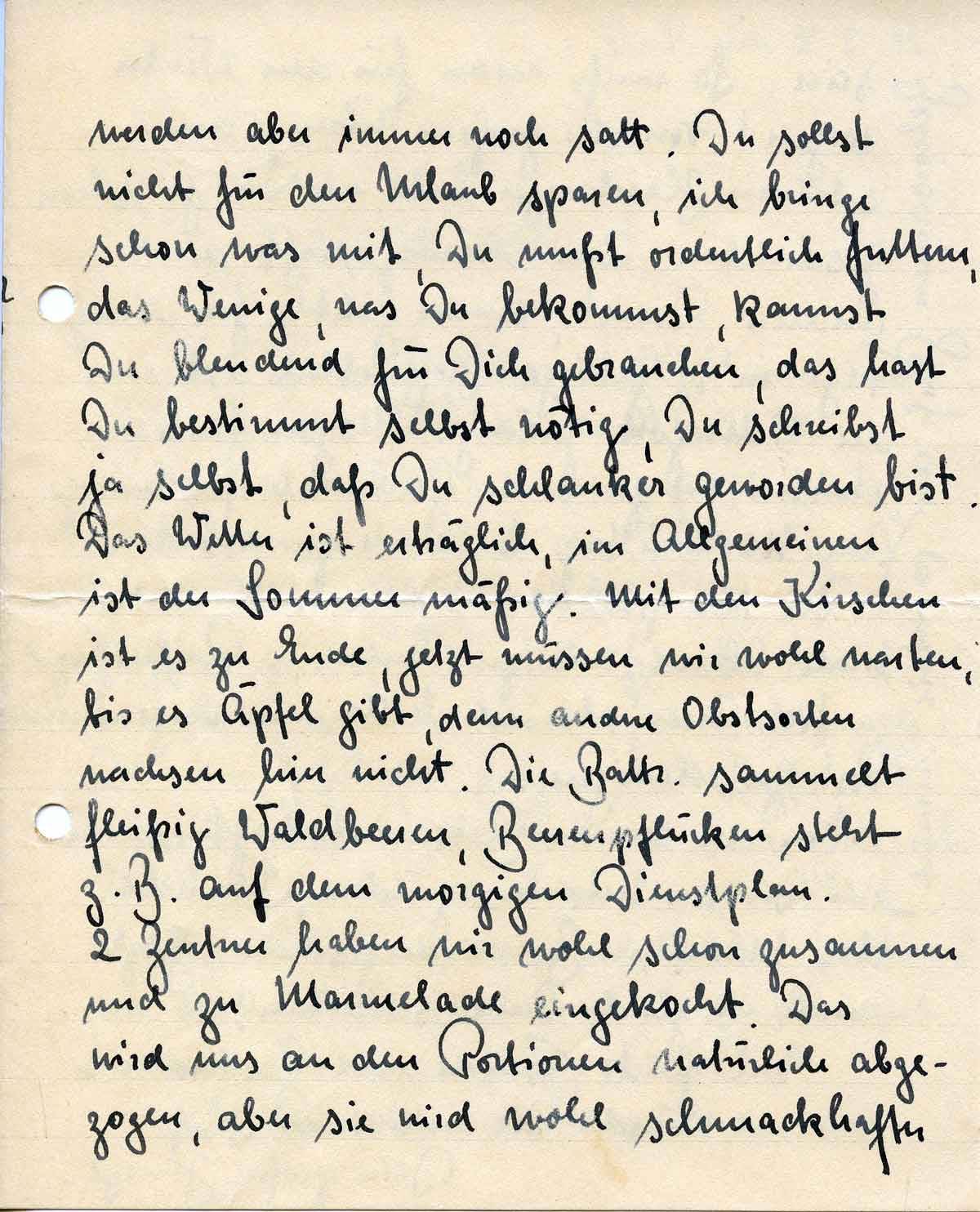 werden aber immer noch satt. Du sollst nicht für den Urlaub sparen, ich bringe schon was mit, Du mußt ordentlich futtern, das Wenige, was Du bekommst, kannst Du blendend für Dich gebrauchen, das hast Du bestimmt selbst nötig, Du schreibst ja selbst, daß Du schlanker geworden bist. Das Wetter ist erträglich, im Allgemeinen ist der Sommer mäßig. Mit den Kirschen ist es zu Ende, jetzt müssen wir wohl warten, bis es Äpfel gibt, denn andere Obstsorten wachsen hier nicht. Die Battr. sammelt fleißig Waldbeeren, Beerenpflücken steht z. B. auf dem morgigen Dienstplan. 2 Zentner haben wir wohl schon zusammen und zu Marmelade eingekocht. Das wird uns an den Portionen natürlich abgezogen, aber sie wird wohl schmackhafter