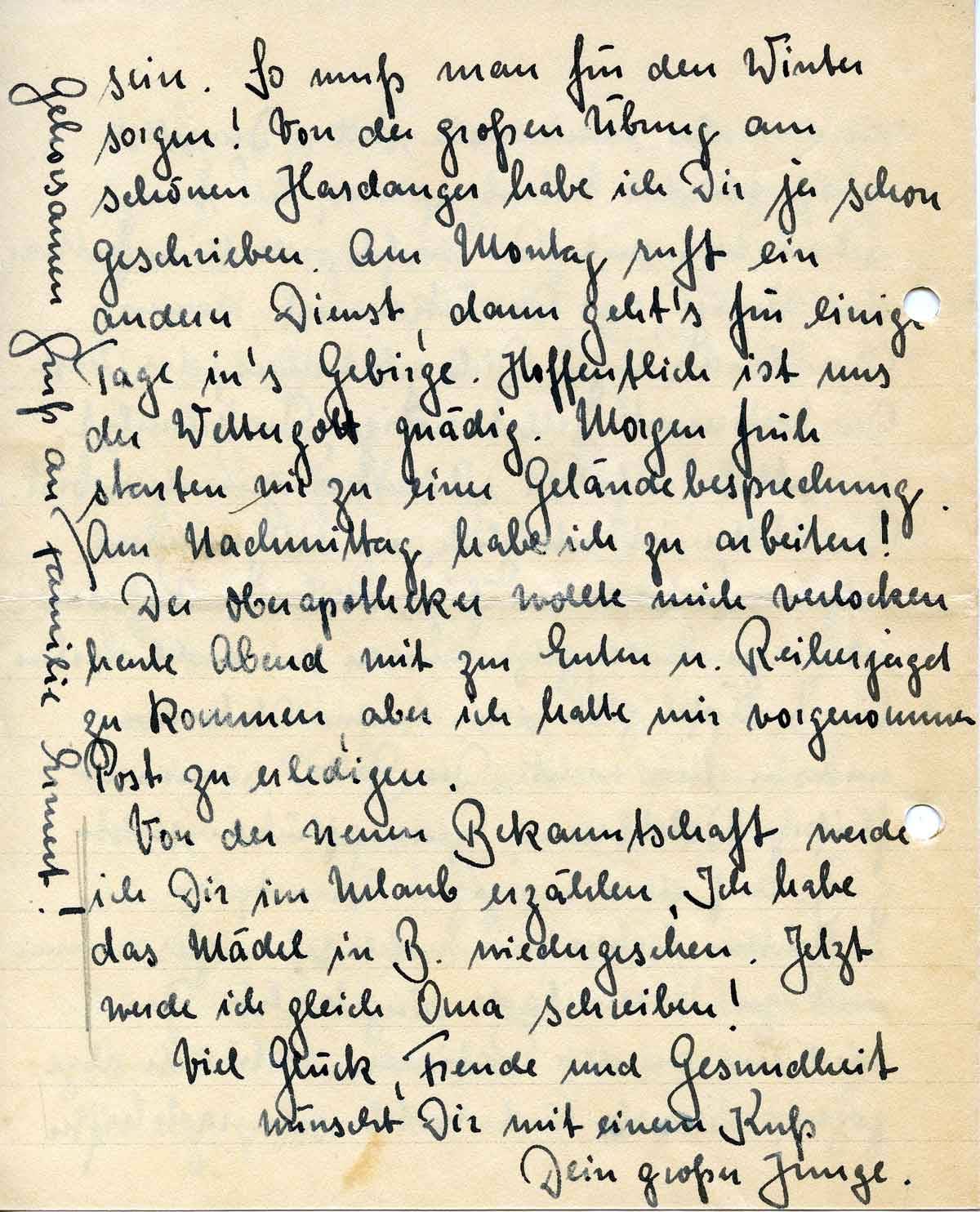 sein. So muß man für den Winter sorgen! Von der großen Übung am schönen Hardanger habe ich Dir ja schon geschrieben. Am Montag ruft ein anderer Dienst, dann geht’s für einige Tage in’s Gebirge. Hoffentlich ist uns der Wettergott gnädig. Morgen früh starten wir zu einer Geländebesprechung. Am Nachmittag habe ich zu arbeiten!