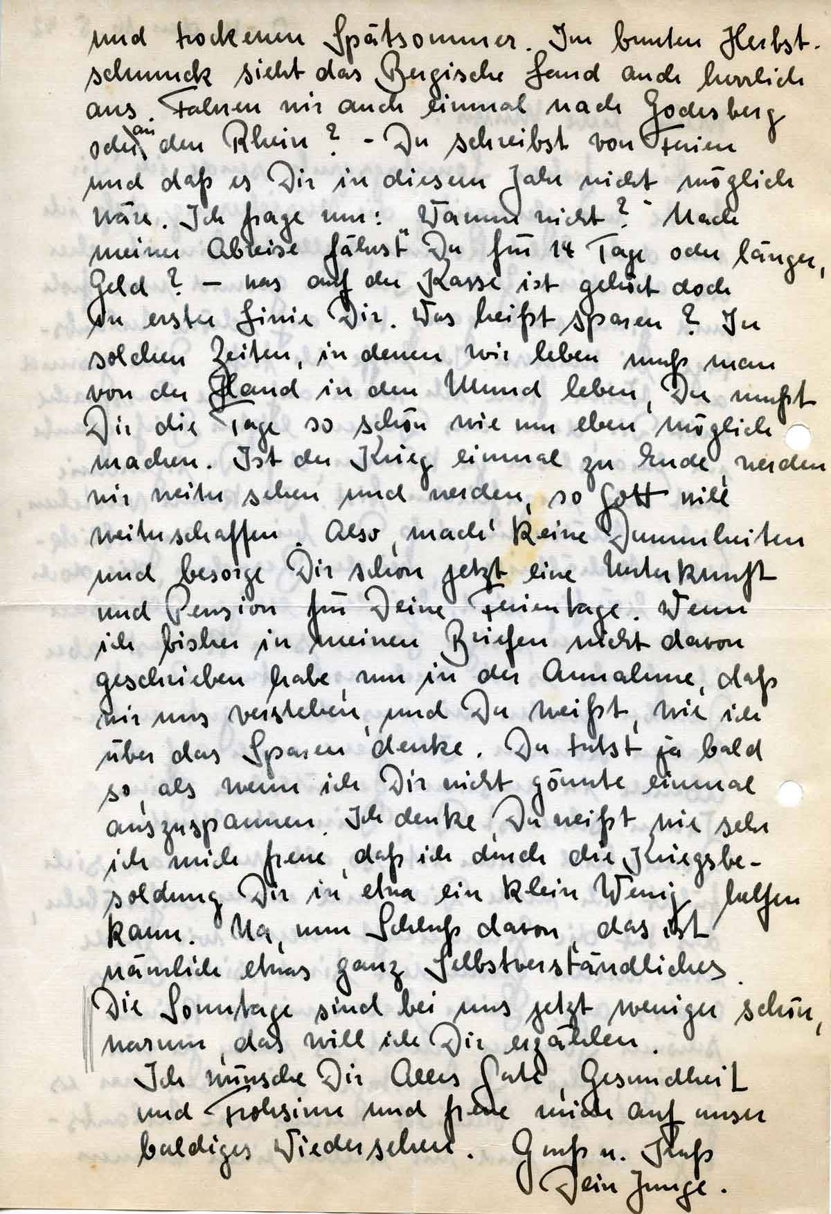 und trockenen Spätsommer. Im bunten Herbstschmuck sieht das Bergische Land auch herrlich aus. Fahren wir auch einmal nach Godesberg oder an den Rhein? – Du schreibst von Ferien und daß es Dir in diesem Jahr nicht möglich wäre. Ich frage nur: „Warum nicht?“ Nach meiner Abreise fährst Du für 14 Tage oder länger, Geld? – was auf der Kasse ist gehört doch in erster Linie Dir. Was heißt sparen? In solchen Zeiten, in denen wir leben muß man von der Hand in den Mund leben, Du mußt Dir die Tage so schön wie nur eben möglich machen. Ist der Krieg einmal zu Ende, werden wir weiter sehen und werden, so Gott will weiterschaffen. Also, mach‘ keine Dummheiten und besorge Dir schon jetzt eine Unterkunft und Pension für Deine Ferientage. Wenn ich bisher in meinen Briefen nicht davon geschrieben habe, nur in der Annahme, daß wir uns verstehen, und Du weißt, wie ich über das Sparen denke. Du tust ja bald so, als wenn ich Dir nicht gönnte einmal auszuspannen. Ich denke, Du weißt wie sehr ich mich freue, daß ich durch die Kriegsbesoldung Dir in etwa ein klein Wenig helfen kann. Na, nun Schluß davon, das ist nämlich etwas ganz Selbstverständliches. Die Sonntage sind bei uns jetzt weniger schön, warum, das will ich Dir erzählen.