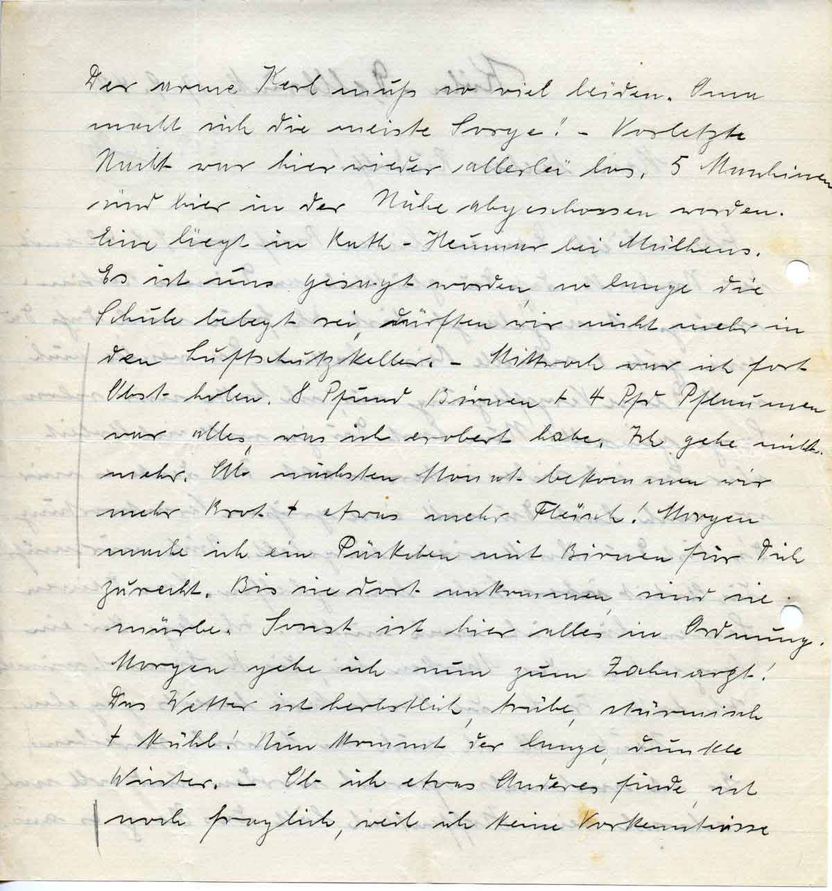 Der arme Kerl muß so viel leiden. Oma macht sich die meiste Sorge! – Vorletzte Nacht war hier wieder allerlei los. 5 Maschinen sind hier in der Nähe abgeschossen worden. Eine liegt in Rath-Heumar bei Mülhens. Es ist uns gesagt worden, so lange die Schule belegt sei, dürften wir nicht mehr in den Luftschutzkeller. – Mittwoch war ich fort Obst holen. 8 Pfund Birnen + 4 Pfd Pflaumen war alles, was ich erobert habe. Ich gehe nicht mehr. Ab nächsten Monat bekommen wir mehr Brot + etwas mehr Fleisch! Morgen mache ich ein Päckchen mit Birnen für Dich zurecht. Bis sie dort ankommen sind sie mürbe. Sonst ist hier alles in Ordnung. Morgen gehe ich nun zum Zahnarzt! Das Wetter ist herbstlich, trübe, stürmisch + kühl! Nun kommt der lange, dunkle Winter. – Ob ich etwas Anderes finde, ist noch fraglich, weil ich keine Vorkenntnisse