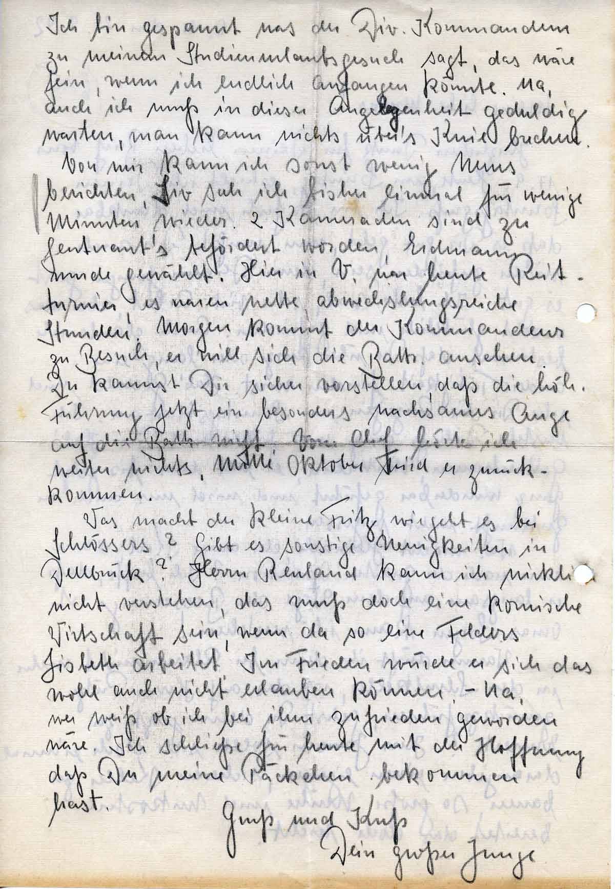 Was macht der kleine Fritz, wie geht es bei Schlössers? Gibt es sonstige Neuigkeiten in Dellbrück? Herrn Reuland kann ich wirklich nicht verstehen, das muß doch eine komische Wirtschaft sein, wenn da so eine Felders Liesbeth arbeitet. Im Frieden würde er sich das wohl auch nicht erlauben können. – Na, wer weiß ob ich bei ihm zufrieden geworden wäre. Ich schließe für heute mit der Hoffnung daß Du meine Päckchen bekommen hast.
