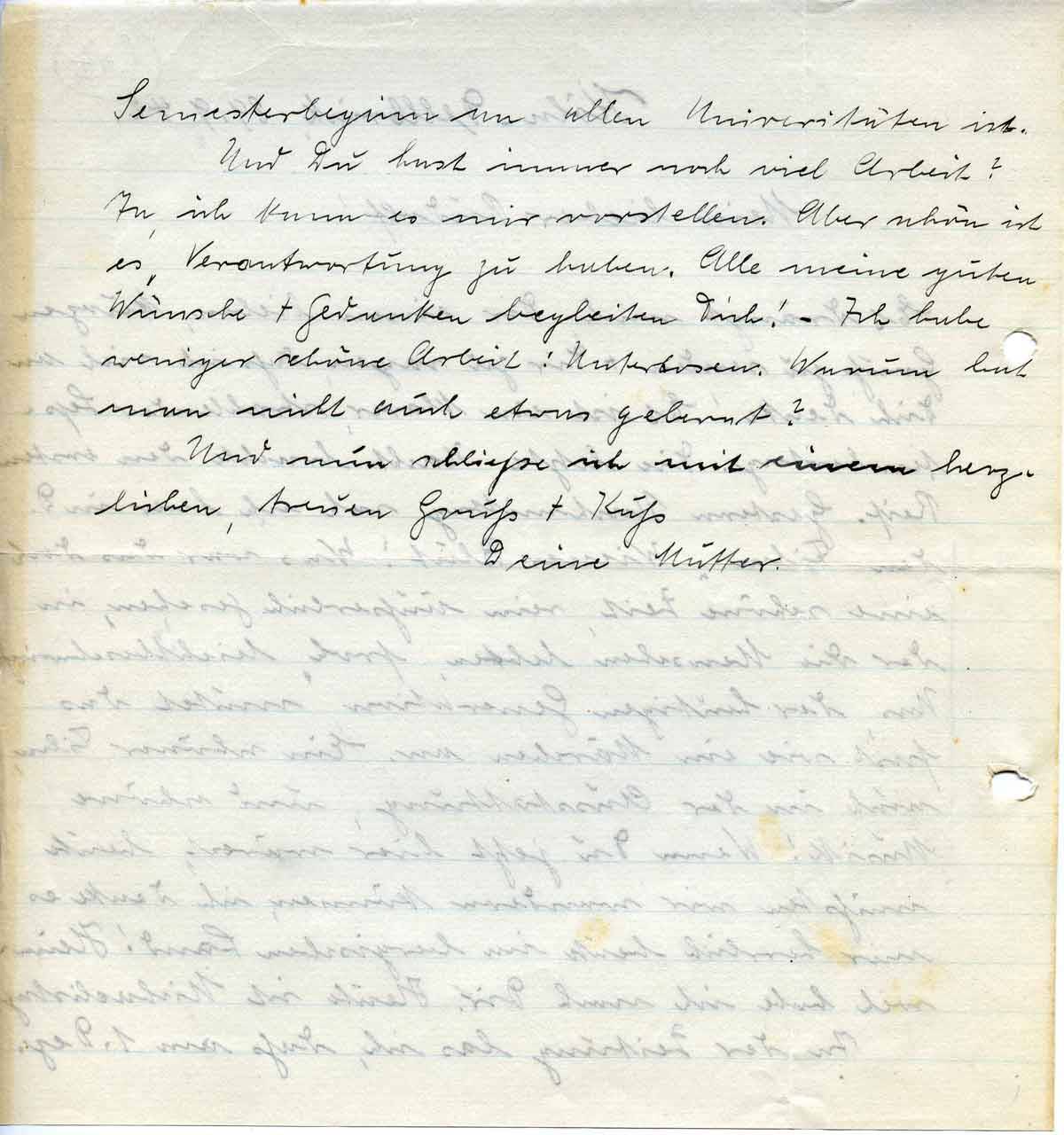 Es drängt mich, Dir einen lieben, kurzen Gruß zu senden + Dir zu sagen, daß ich viel an Dich denke! Es ist ein klarer, strahlender Septembertag. Die letzte Nacht brachte den ersten Reif. Gestern Nachmittag sah ich hier in D. den Film „Wiener Blut“. Was war das doch eine schöne Zeit, rein äußerlich gesehen, in der die Menschen lebten, froh, leichtbeschwingt. Uns, der heutigen Generation, mutet das fast wie ein Märchen an. Ein schöner Film, auch in der Ausstattung, und schöne Musik! Wenn Du jetzt hier wärest, heute müßten wir wandern können, ich denke es mir herrlich heute im bergischen Land! Heimweh habe ich nach Dir. Heute ist Michaelistag.