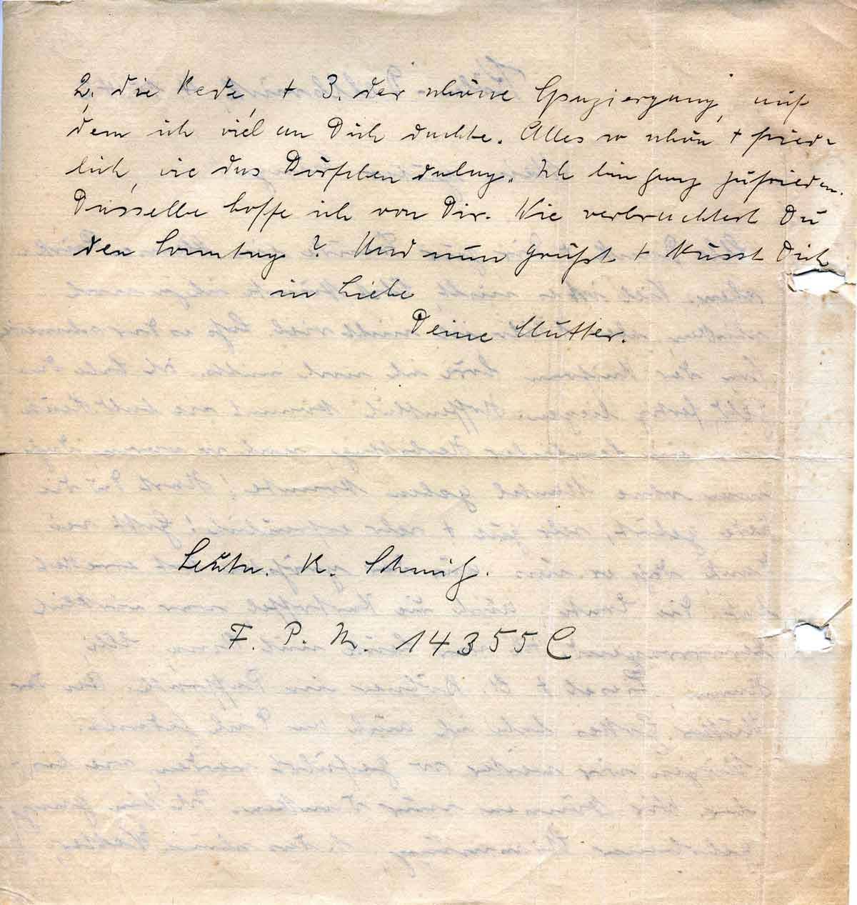 Als Dank + Dir zur Freude ein kleines Päckchen. Viel ist es nicht, Obst könnte ich ja noch schicken, aber 1 Kilo ist nicht viel. Laß es Dir schmecken. Von der Uniform höre ich noch nichts. Ich habe das Geld fertig liegen. Hoffentlich kommt sie bald. Heute war ein herrlicher Herbsttag, noch so warm, daß man ohne Mantel gehen konnte! Hast Du die Rede gehört, sehr gut + sehr erfreulich! Gott sei Dank, daß er uns aus der größten Not errettet hat. Die Ernte, auch die Kartoffel, war wirklich hervorragend. Ich war heute mit Oma, Elli, Hanni, Liesel + A. Böhner in Paffrath. Bei der Mutter Gottes habe ich auch an Dich gedacht! Mögen wir weiter so geführt werden, wie bisher. Wir können nur danken. Ich bin ganz gehobener Stimmung, 1. das schöne Wetter,