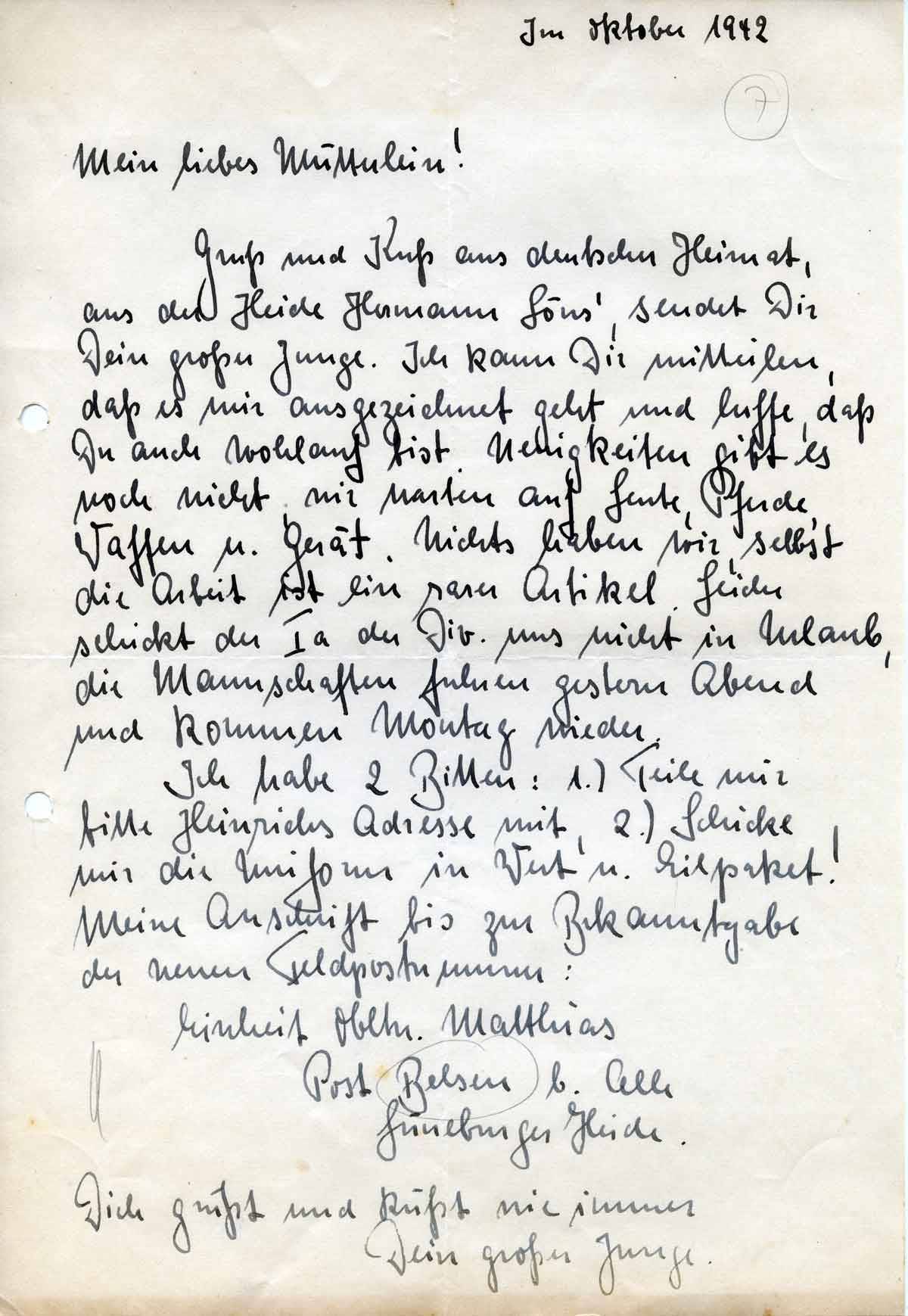 Gruß und Kuß aus deutscher Heimat, aus der Heide Hermann Löns‘, sendet Dir Dein großer Junge. Ich kann Dir mitteilen, daß es mir ausgezeichnet geht und hoffe, daß Du auch wohlauf bist. Neuigkeiten gibt es noch nicht, wir warten auf Leute, Pferde, Waffen u. Gerät. Nichts haben wir, selbst die Arbeit ist ein rarer Artikel. Leider schickt der I a der Div. uns nicht in Urlaub, die Mannschaften fuhren gestern Abend und kommen Montag wieder.