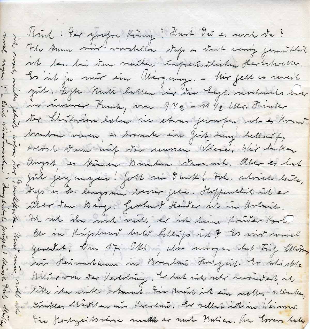 Buch „Der große König“. Hast Du es noch da? Ich kann mir vorstellen, daß es dort wenig gemütlich ist, bes. bei dem rauhen, unfreundlichen Herbstwetter. Es ist ja nur ein Übergang. – Mir geht es soweit gut. Letzte Nacht hatten wir die Engl. nochmals hier in unserer Kante, von 9 ½-11 ½ Uhr. Hinter der Schulwiese haben sie etwas geworfen, ob es Brandbomben waren, es brannte eine Zeit lang hellauf, erlosch dann auf der nassen Wiese. Wir hatten Angst, es kämen Bomben darnach. Aber es hat gut gegangen! Gott sei Dank! Joh. schrieb heute, daß es H. langsam besser gehe. Hoffentlich ist er über den Berg. Gerhard Heider ist in Urlaub. Ich sah ihn noch nicht, er ist beim Bruder Karl. Ob in Rußland bald Schluß ist? Es wird soviel geredet. Am 17. Okt., also morgen hat Fritz Schlösser aus Heusenstamm in Breslau Hochzeit. Er schickte Bilder von der Verlobung. Er hat sich sehr verändert, ich hätte ihn nicht erkannt. Die Braut ist ein nettes, schlankes, dunkles Mädchen aus Breslau. Er selbst ist in Weimar. Die Hochzeitsreise macht er nach Italien. Von Essers habe