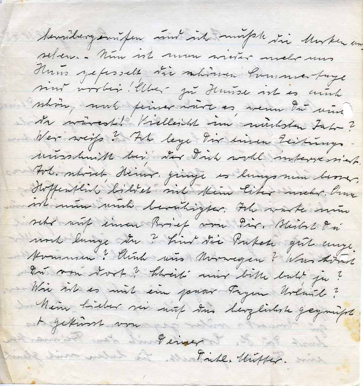 herübergerufen und ich mußte die Marken ansehen. – Nun ist man wieder mehr ans Haus gefesselt, die schönen Sommertage sind vorbei! Aber zu Hause ist es auch schön; noch feiner wäre es, wenn Du auch da wärest! Vielleicht im nächsten Jahr? Wer weiß? Ich lege Dir einen Zeitungsausschnitt bei, der Dich wohl interessiert. Joh. schrieb, Heinr. ginge es langsam besser. Hoffentlich bildet sich kein Eiter mehr. Oma ist nun auch beruhigter. Ich warte nun sehr auf einen Brief von Dir. Bleibst Du noch lange da? Sind die Pakete gut angekommen? Auch aus Norwegen? Was hörst Du von dort? Schreib‘ mir bitte bald, ja? Wie ist es mit ein paar Tagen Urlaub? Mein Lieber sei auf das herzlichste gegrüßt + geküsst von