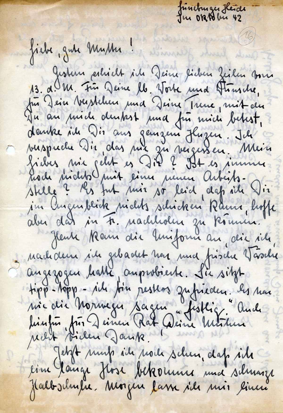Gestern erhielt ich Deine lieben Zeilen vom 13. d. M. Für Deine lb. Worte und Wünsche, für Dein Verstehen und Deine Treue, mit der Du an mich denkst und für mich betest, danke ich Dir aus ganzem Herzen. Ich verspreche Dir, das nie zu vergessen. Mein Liebes, wie geht es Dir? Ist es immer noch nichts mit einer neuen Arbeitsstelle? Es tut mir so leid, daß ich Dir im Augenblick nichts schicken kann, hoffe aber das in Fr. nachholen zu können.