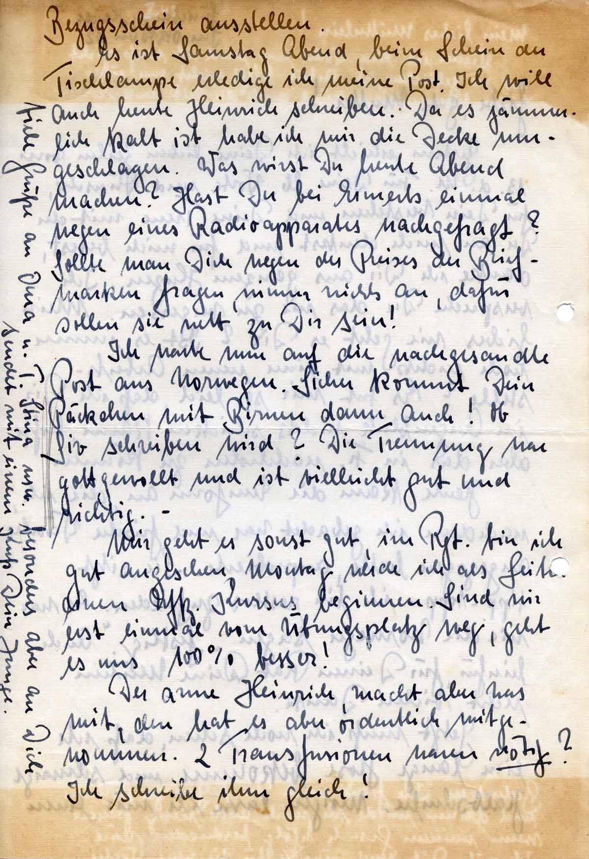 Es ist Samstag Abend, beim Schein der Tischlampe erledige ich meine Post. Ich will auch heute Heinrich schreiben. Da es jämmerlich kalt ist habe ich mir die Decke umgeschlagen. Was wirst Du heute Abend machen? Hast Du bei Ermerts einmal wegen eines Radioapparates nachgefragt? Sollte man Dich wegen des Preises der Briefmarken fragen, nimm nichts an, dafür sollen sie nett zu Dir sein!