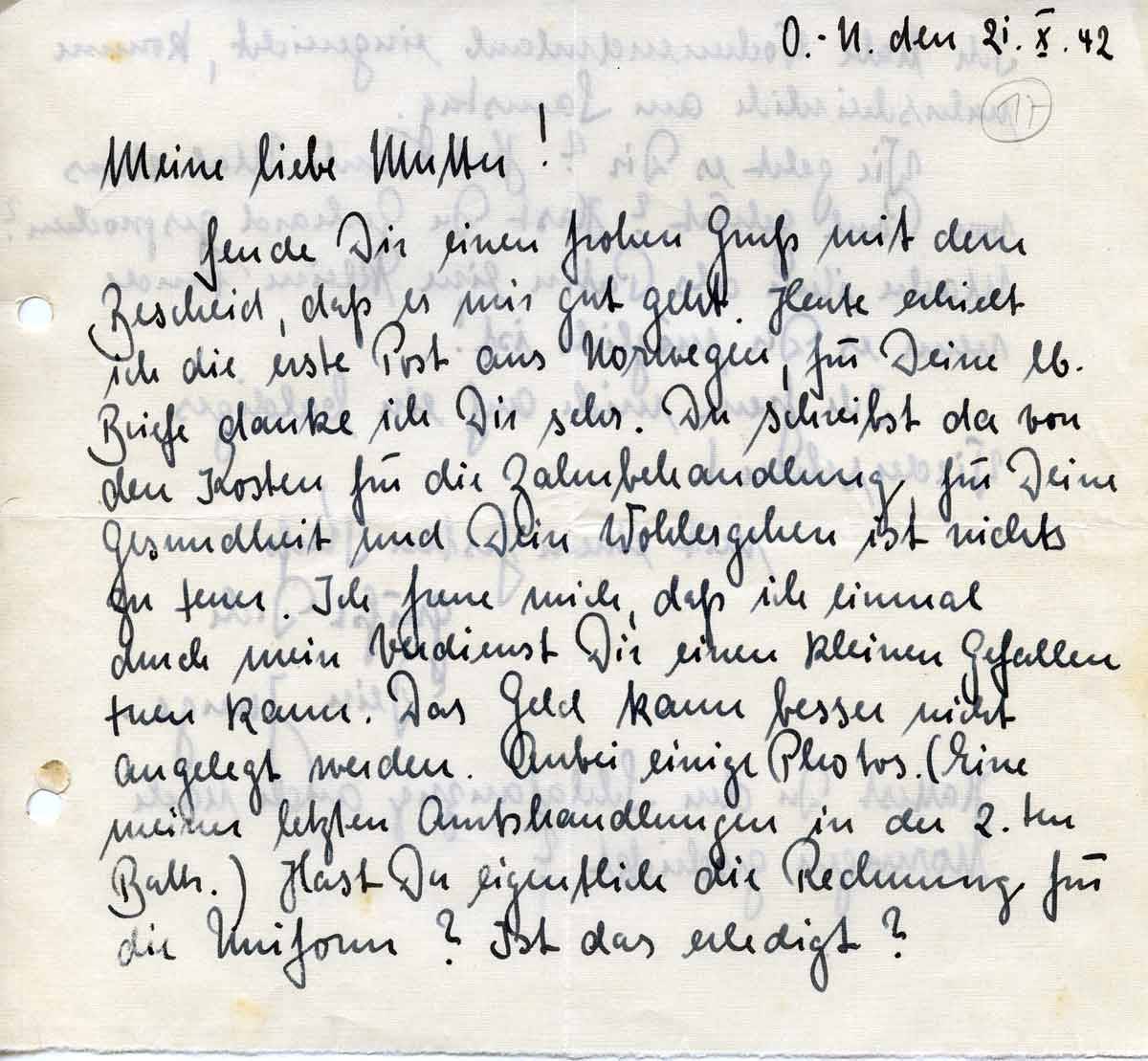 Sende Dir einen frohen Gruß mit dem Bescheid, daß es mir gut geht. Heute erhielt ich die erste Post aus Norwegen, für Deine lb. Briefe danke ich Dir sehr. Du schreibst da von den Kosten für die Zahnbehandlung, für Deine Gesundheit und Dein Wohlergehen ist nichts zu teuer. Ich freue mich, daß ich einmal durch mein Verdienst Dir einen kleinen Gefallen tuen kann. Das Geld kann besser nicht angelegt werden. Anbei einige Photos. (Eine meiner letzten Amtshandlungen in der 2.ten Battr.) Hast Du eigentlich die Rechnung für die Uniform? Ist das erledigt?