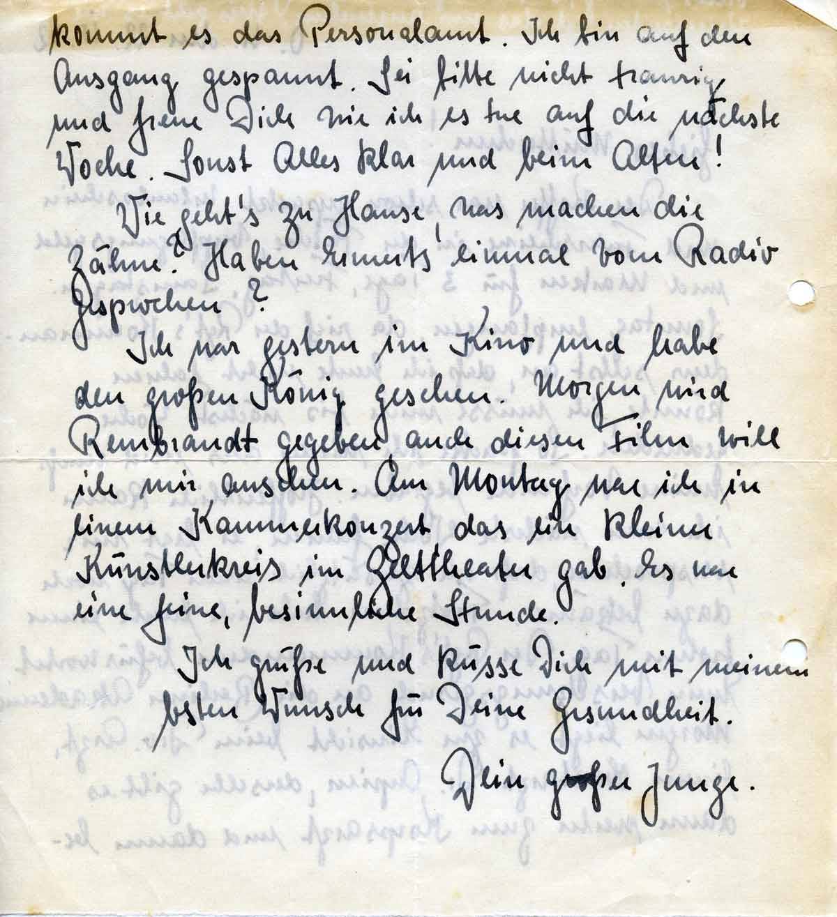 Ich war gestern im Kino und habe den großen König gesehen. Morgen wird Rembrandt gegeben, auch diesen Film will ich mir ansehen. Am Montag war ich in einem Kammerkonzert, das ein kleiner Künstlerkreis im Zelttheater gab. Es war eine feine, besinnliche Stunde.