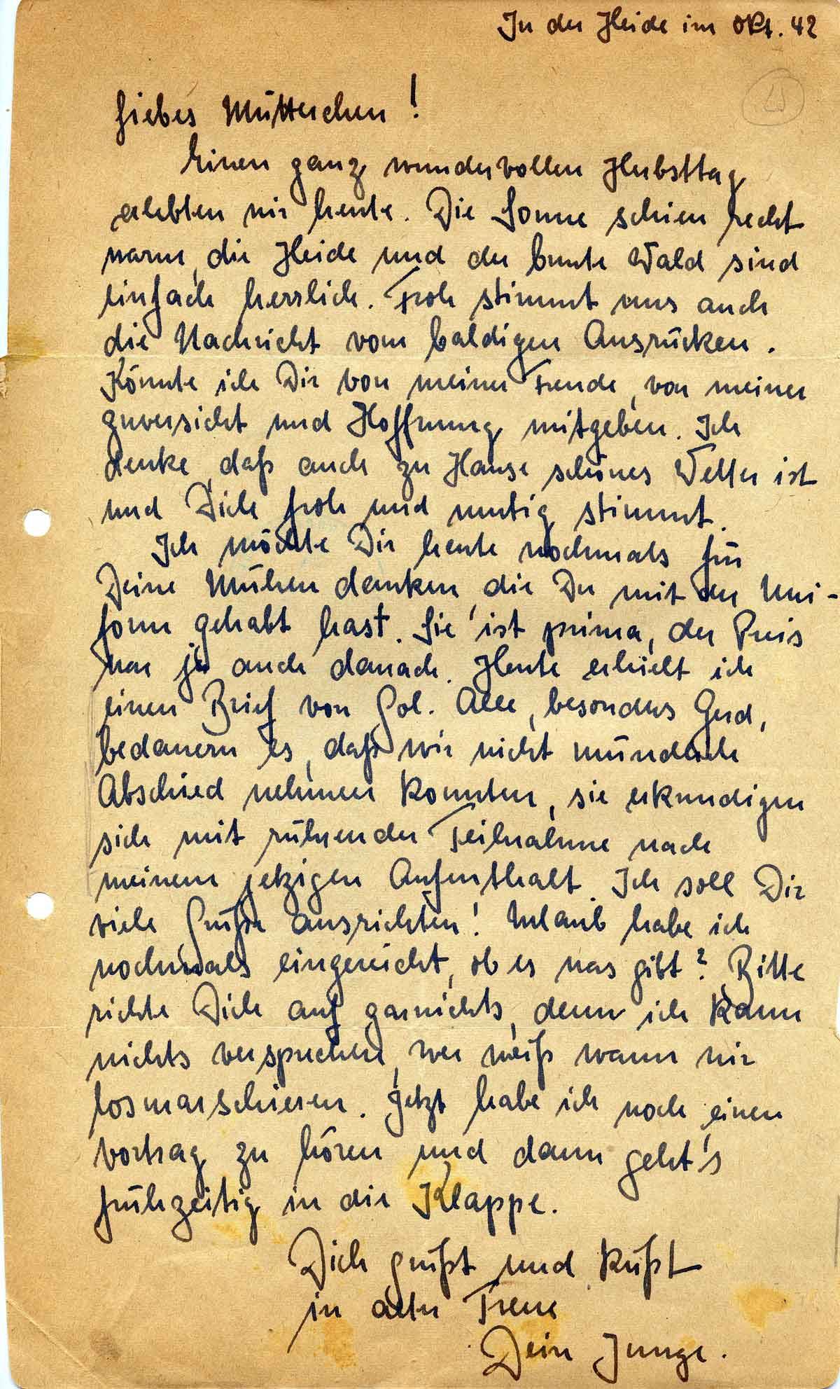 Einen ganz wundervollen Herbsttag erlebten wir heute. Die Sonne schien recht warm, die Heide und der bunte Wald sind einfach herrlich. Froh stimmt uns auch die Nachricht vom baldigen Ausrücken. Könnte ich Dir von meiner Freude, von meiner Zuversicht und Hoffnung mitgeben. Ich denke, daß auch zu Hause schönes Wetter ist und Dich froh und mutig stimmt.
