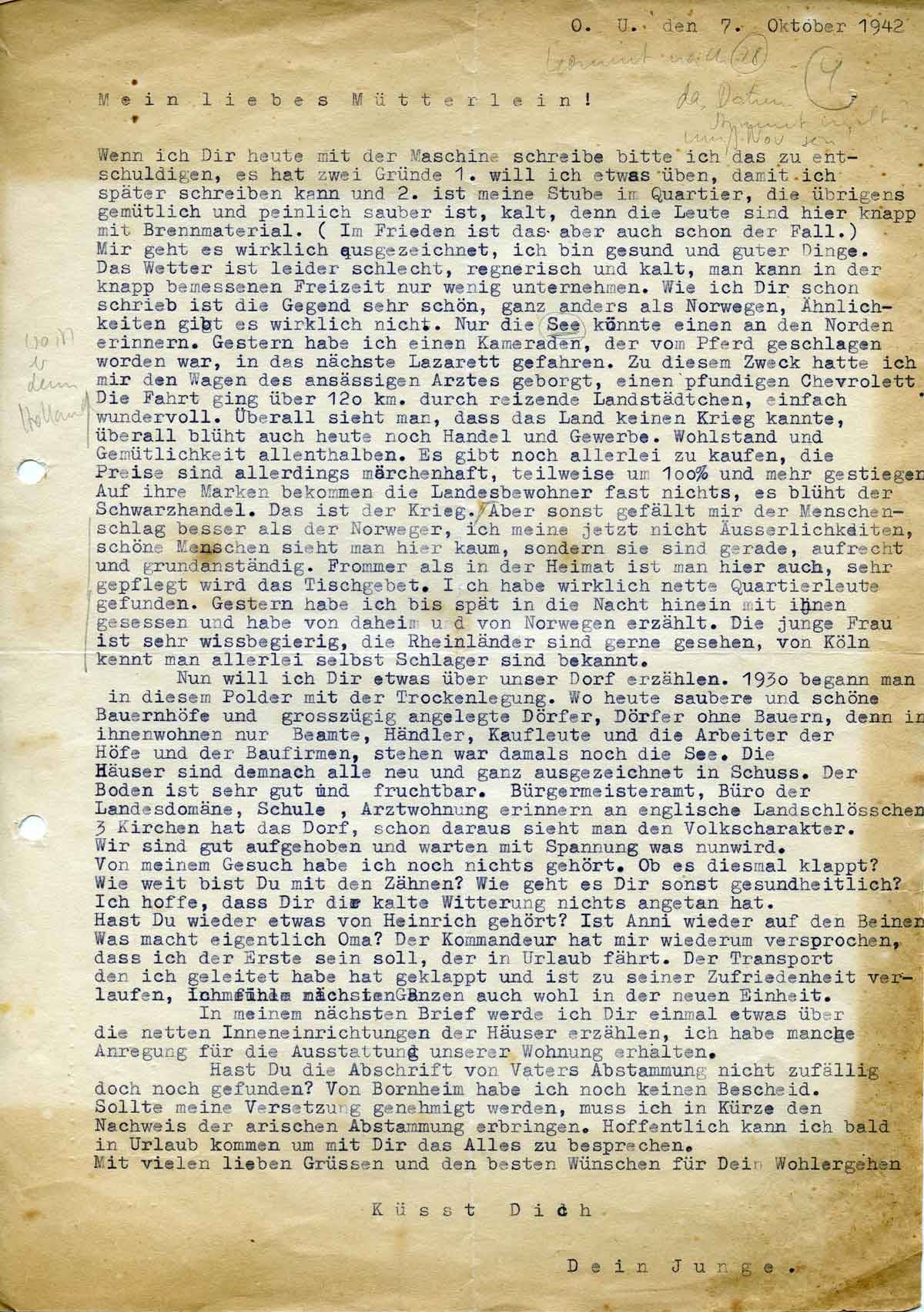 Wenn ich Dir heute mit der Maschine schreibe bitte ich das zu entschuldigen, es hat zwei Gründe 1. will ich etwas üben, damit ich später schreiben kann und 2. ist meine Stube im Quartier, die übrigens gemütlich und peinlich sauber ist, kalt, denn die Leute sind hier knapp mit Brennmaterial. (Im Frieden ist das aber auch schon der Fall.) Mir geht es wirklich ausgezeichnet, ich bin gesund und guter Dinge. Das Wetter ist leider schlecht, regnerisch und kalt, man kann in der knapp bemessenen Freizeit nur wenig unternehmen. Wie ich Dir schon schrieb ist die Gegend sehr schön, ganz anders als Norwegen, Ähnlichkeiten gibt es wirklich nicht. Nur die See könnte einen an den Norden erinnern. Gestern habe ich einen Kameraden, der vom Pferd geschlagen worden war, in das nächste Lazarett gefahren. Zu diesem Zweck hatte ich mir den Wagen des ansässigen Arztes geborgt, einen pfundigen Chevrolett. Die Fahrt ging über 120 km. durch reizende Landstädtchen, einfach wundervoll. Überall sieht man, dass das Land keinen Krieg kannte, überall blüht auch heute noch Handel und Gewerbe. Wohlstand und Gemütlichkeit allenthalben. Es gibt noch allerlei zu kaufen, die Preise sind allerdings märchenhaft, teilweise um 100 % und mehr gestiegen. Auf ihrer Marken bekommen die Landesbewohner fast nichts, es blüht der Schwarzhandel. Das ist der Krieg. Aber sonst gefällt mir der Menschenschlag besser als der Norweger, ich meine jetzt nicht Äusserlichkeiten, schöne Menschen sieht man hier kaum, sondern sie sind gerade, aufrecht und grundanständig. Frommer als in der Heimat ist man hier auch, sehr gepflegt wird das Tischgebet. Ich habe wirklich nette Quartierleute gefunden. Gestern habe ich bis spät in die Nacht hinein mit ihnen gesessen und habe von daheim und von Norwegen erzählt. Die junge Frau ist sehr wissbegierig, die Rheinländer sind gerne gesehen, von Köln kennt man allerlei selbst Schlager sind bekannt.