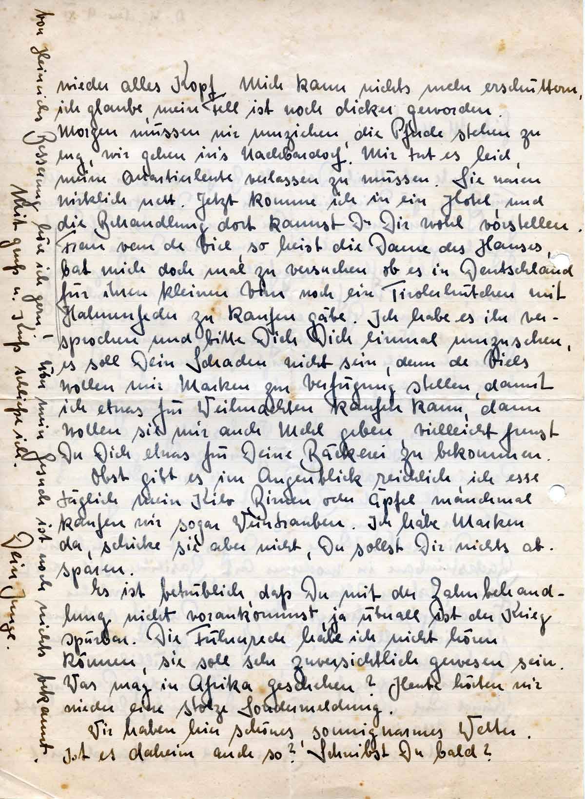 wieder alles Kopf. Mich kann nichts mehr erschüttern, ich glaube, mein Fell ist noch dicker geworden. Morgen müssen wir umziehen, die Pferde stehen zu eng, wir gehen in’s Nachbardorf. Mir tut es leid, meine Quartierleute verlassen zu müssen. Sie waren wirklich nett. Jetzt komme ich in ein Hotel, und die Behandlung dort kannst Du Dir wohl vorstellen. Frau van de Viel, so heist die Dame des Hauses, bat mich doch mal zu versuchen ob es in Deutschland für ihren kleinen Vim noch ein Tirolerhütchen mit Hahnenfeder zu kaufen gäbe. Ich habe es ihr versprochen und bitte Dich Dich einmal umzusehen, es soll Dein Schaden nicht sein, denn de Viels wollen mir Marken zur Verfügung stellen, damit ich etwas für Weihnachten kaufen kann, dann wollen sie mir auch Mehl geben, vielleicht freust Du Dich etwas für Deine Bäckerei zu bekommen.