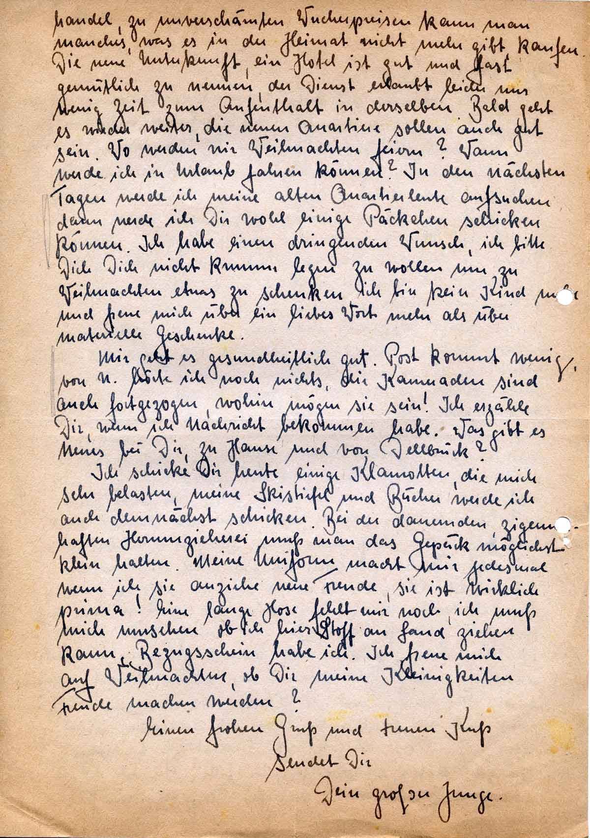 handel, zu unverschämten Wucherpreisen kann man manches, was es in der Heimat nicht mehr gibt, kaufen. Die neue Unterkunft, ein Hotel ist gut und fast gemütlich zu nennen, der Dienst erlaubt leider nur wenig Zeit zum Aufenthalt in derselben. Bald geht es wieder weiter, die neuen Quartiere sollen auch gut sein. Wo werden wir Weihnachten feiern? Wann werde ich in Urlaub fahren können? In den nächsten Tagen werde ich meine alten Quartierleute aufsuchen, dann werde ich Dir wohl einige Päckchen schicken können. Ich habe einen dringenden Wunsch, ich bitte Dich Dich nicht krumm legen zu wollen um zu Weihnachten etwas zu schenken, ich bin kein Kind mehr und freue mich über ein liebes Wort mehr als über materielle Geschenke.