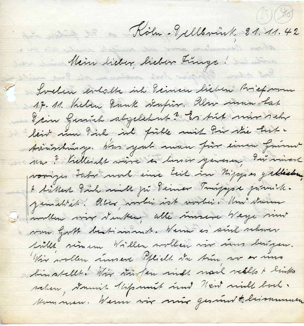 Soeben erhalte ich Deinen lieben Brief vom 17.11. Vielen Dank dafür. Also man hat Dein Gesuch abgelehnt? Es tut mir sehr leid um Dich, ich fühle mit Dir die Enttäuschung. Was gab man für einen Grund an? Vielleicht wäre es besser gewesen, Du wärest voriges Jahr noch eine Zeit in Nippes geblieben, + hättest Dich nicht zu Deiner Truppe zurückgemeldet! Aber, vorbei ist vorbei. Und dann wollen wir denken, alle unsere Wege sind von Gott bestimmt. Wenn es auch schwer fällt, seinem Willen wollen wir uns beugen. Wir wollen unsere Pflicht da tun, wo er uns hinstellt! Wir dürfen nicht nach rechts + links sehen, damit Mißmut und Neid nicht hochkommen. Wenn wir nur gesund + beisammen