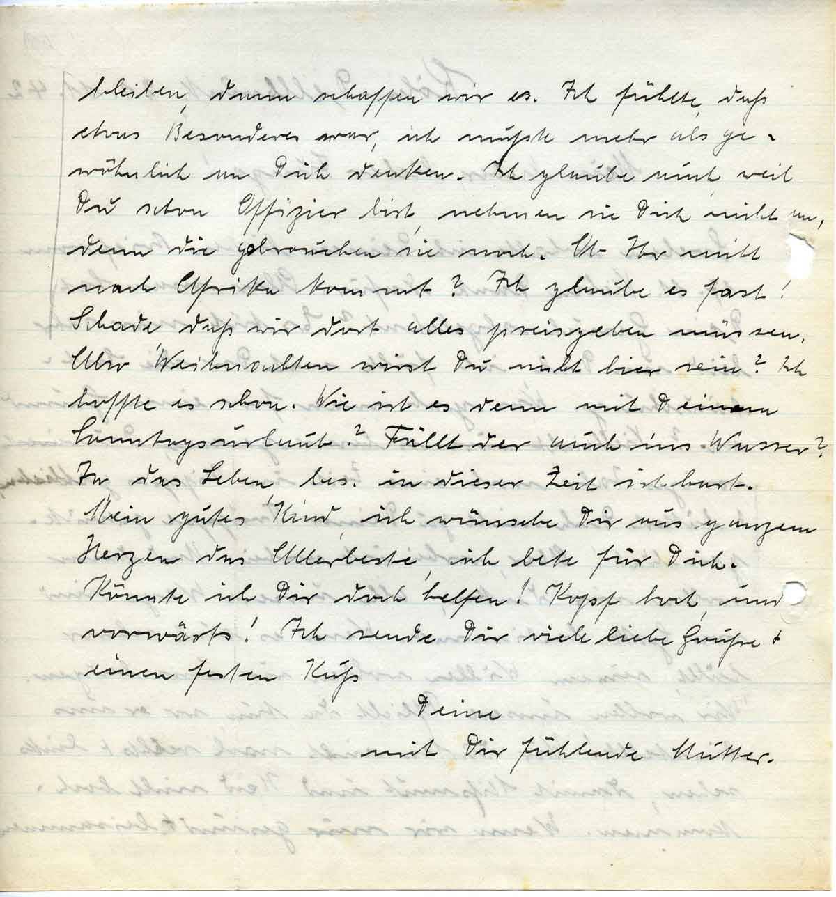 bleiben, dann schaffen wir es. Ich fühlte, daß etwas Besonderes war, ich mußte mehr als gewöhnlich an Dich denken. Ich glaube auch, weil Du schon Offizier bist, nehmen sie Dich nicht an, denn die gebrauchen sie noch. Ob Ihr nicht nach Afrika kommt? Ich glaube es fast! Schade, daß wir dort alles preisgeben müssen. Also Weihnachten wirst Du nicht hier sein? Ich hoffte es schon. Wie ist es denn mit Deinem Sonntagsurlaub? Fällt der auch ins Wasser? Ja, das Leben, bes. in dieser Zeit ist hart. Mein gutes Kind, ich wünsche Dir aus ganzem Herzen das Allerbeste, ich bete für Dich. Könnte ich Dir doch helfen! Kopf hoch, und vorwärts! Ich sende Dir viele liebe Grüße + einen festen Kuß