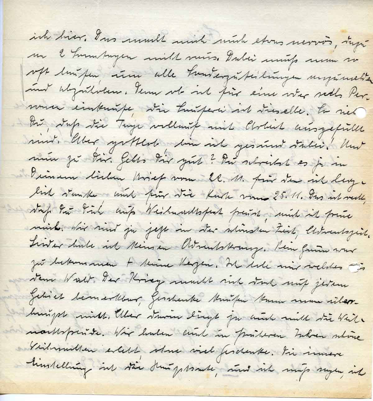 ich hier. Das macht mich auch etwas nervös, dazu an 2 Sonntagen nicht raus. Dabei muß man so oft laufen, um alle Sonderzuteilungen anzumelden und abzuholen. Denn ob ich für eine oder sechs Personen einkaufe, die Lauferei ist dieselbe. So siehst Du, daß die Tage vollauf mit Arbeit ausgefüllt sind. Aber, gottlob, bin ich gesund dabei! Und nun zu Dir. Geht’s Dir gut? Du schreibst es ja in Deinem lieben Brief vom 22.11. für den ich herzlich danke, auch für die Karte vom 25.11. Das ist recht, daß Du Dich aufs Weihnachtsfest freust, auch ich freue mich. Wir sind ja jetzt in der schönsten Zeit, Adventszeit. Leider habe ich keinen Adventskranz. Kein Grün war zu bekommen + keine Kerzen. Ich hole mir welches aus dem Wald. Der Krieg macht sich doch auf jedem Gebiet bemerkbar, Geschenke kaufen kann man überhaupt nicht. Aber darin liegt ja auch nicht die Weihnachtsfreude. Wir haben auch in früheren Jahren schöne Weihnachten erlebt, ohne viele Geschenke. Die innere Einstellung ist die Hauptsache, und ich muß sagen, ich