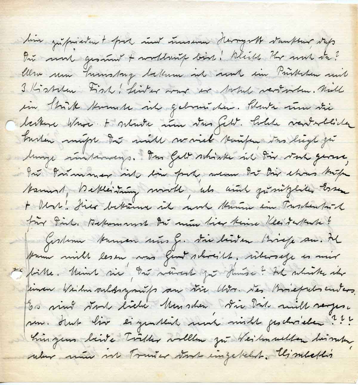 bin zufrieden + froh und unserm Herrgott dankbar, daß Du noch gesund + wohlauf bist! Bleibt Ihr noch da? Also am Samstag bekam ich noch ein Päckchen mit 3 Kistchen Fisch! Leider war er total verdorben. Nicht ein Stück konnte ich gebrauchen. Schade um die leckere Ware + schade um das Geld. Solche verderblichen Sachen mußt Du nicht so viel kaufen, das liegt zu lange unterwegs. Das Geld schicke ich Dir doch gerne, Du Dummer, ich bin froh, wenn Du Dir etwas kaufen kannst, Bekleidung sowohl, als auch zusätzliches Essen + Obst! Hier bekäme ich noch kaum ein Taschentuch für Dich. Bekommst Du nun hier keine Kleiderkarte?