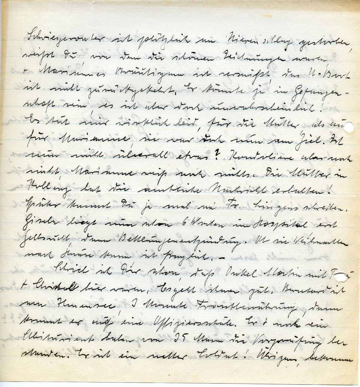 Schwiegervater ist plötzlich an Nierenschlag gestorben, weißt Du, von dem die schönen Zeichnungen waren, + Mariannes Bräutigam ist vermißt, das U-Boot ist nicht zurückgekehrt. Er könnte ja in Gefangenschaft sein, es ist aber doch unwahrscheinlich! Es tut mir wirklich leid, für die Mutter, als auch für Marianne, sie war doch nun am Ziel. Ist nun nicht überall etwas? Kondoliere aber noch nicht, Marianne weiß noch nichts. Die Mutter in Koblenz hat die amtliche Nachricht erhalten! Später kannst Du ja mal an Fr. Lingens schreiben. Gisela liegt nun schon 6 Wochen im Hospital, erst Gelbsucht, dann Bettlungenentzündung. Ob sie Weihnachten nach Hause kann, ist fraglich. –