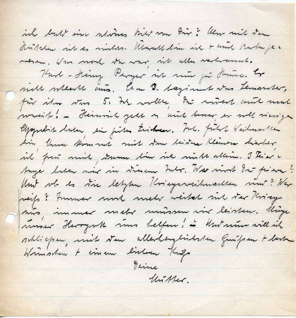 Karl-Heinz Perger ist nun zu Hause. Er sieht schlecht aus. Am 3. beginnt das Semester, für ihn das 5. Ich wollte, Du wärest auch mal soweit! – Heinrich geht es auch besser, er soll riesigen Appetit haben, ein gutes Zeichen. Joh. fährt Weihnachten hin, Oma kommt mit den beiden Kleinen hierher, ich freu mich, dann bin ich nicht allein. 3 Feiertage haben wir in diesem Jahr. Wo wirst Du feiern? Und ob es die letzten Kriegsweihnachten sind? Wer weiß? Immer noch mehr weitet sich der Krieg aus, immer mehr müssen wir leisten. Möge unser Herrgott uns helfen! – Und nun will ich schließen, mit den allerherzlichsten Grüßen + besten Wünschen + einem lieben Kuß