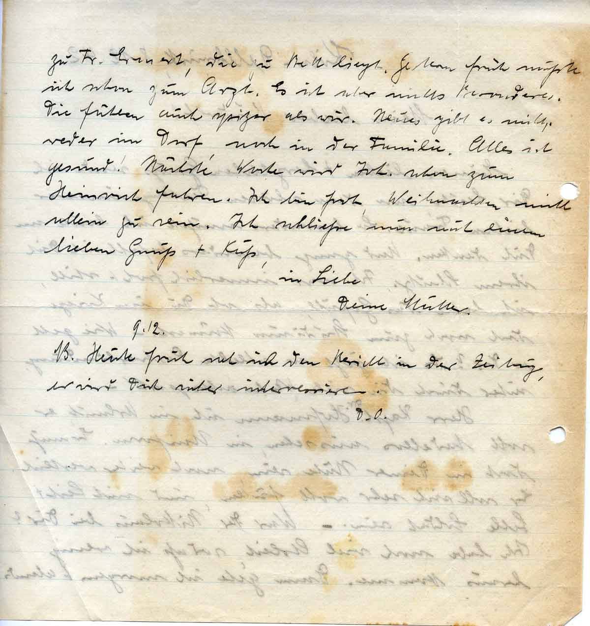 zu Fr. Ermert, die zu Bett liegt. Gestern früh mußte ich schon zum Arzt. Es ist aber nichts Besonderes. Die fühlen auch spitzer als wir. Neues gibt es nichts, weder im Dorf, noch in der Familie. Alles ist gesund! Nächste Woche wird Joh. schon zum Heinrich fahren. Ich bin froh, Weihnachten nicht allein zu sein. Ich schließe nun mit einem lieben Gruß + Kuß,