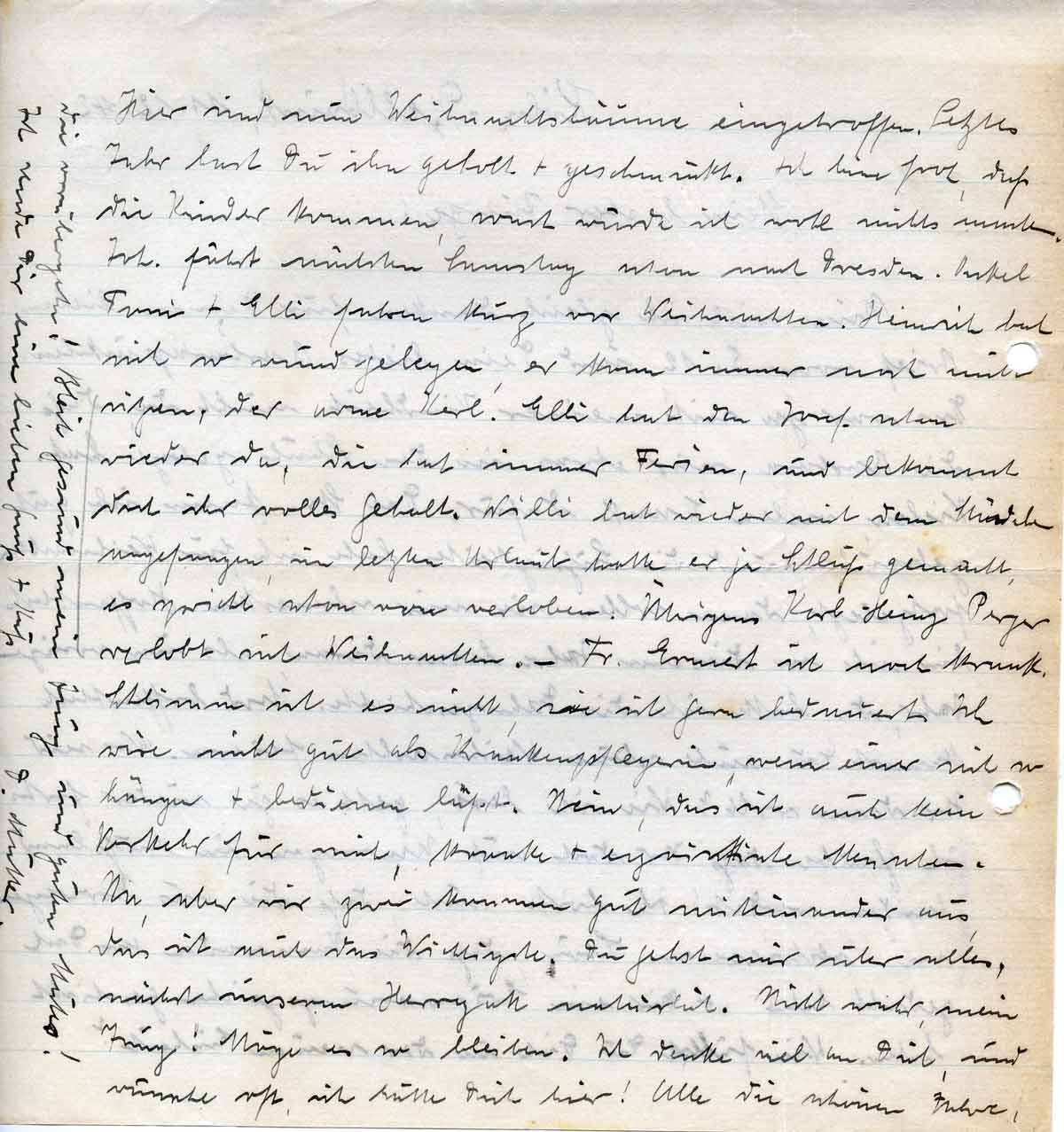Hier sind nun Weihnachtsbäume eingetroffen. Letztes Jahr hast Du ihn geholt + geschmückt. Ich bin froh, daß die Kinder kommen, sonst würde ich wohl nichts machen. Joh. fährt nächsten Samstag schon nach Dresden. Onkel Toni + Elli fahren kurz vor Weihnachten. Heinrich hat sich so wund gelegen, er kann immer noch nicht sitzen, der arme Kerl. Ellli hat den Josef schon wieder da, die hat immer Ferien, und bekommt doch ihr volles Gehalt. Willi hat wieder mit dem Mädchen angefangen, im letzten Urlaub hatte er ja Schluß gemacht, er spricht schon von verloben. Übrigens Karl-Heinz Perger verlobt sich Weihnachten. – Fr. Ermert ist noch krank. Schlimm ist es nicht, sie ist gern bedauert. Ich wäre nicht gut als Krankenpflegerin, wenn einer sich so hängen + bedienen läßt. Nein, das ist auch kein Verkehr für mich, kranke + egoistische Menschen. Na, aber wir zwei kommen gut miteinander aus, das ist auch das Wichtigste. Du gehst mir über alles, nächst unserm Herrgott natürlich. Nicht wahr, mein Jung! Möge es so bleiben. Ich denke viel an Dich, und wünsche oft, ich hätte Dich hier! Alle die schönen Jahre,