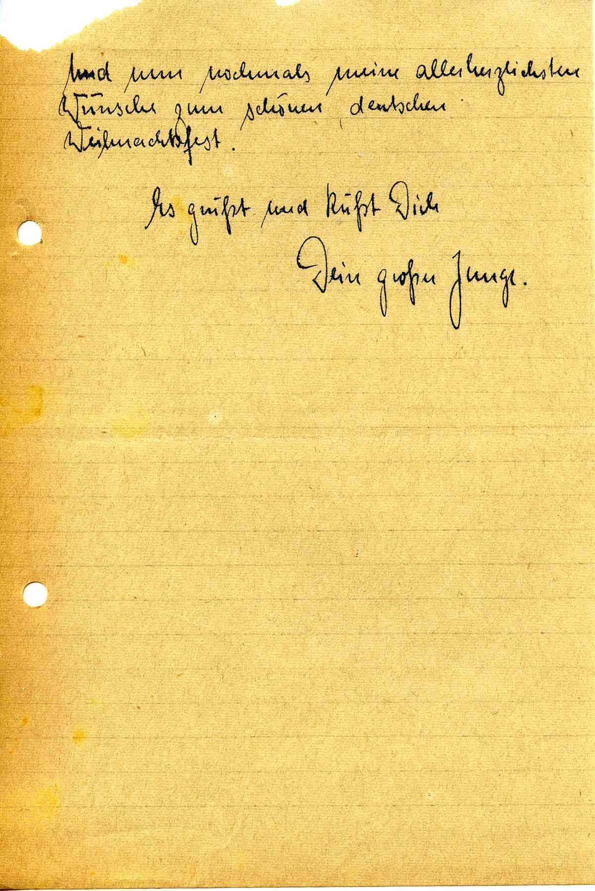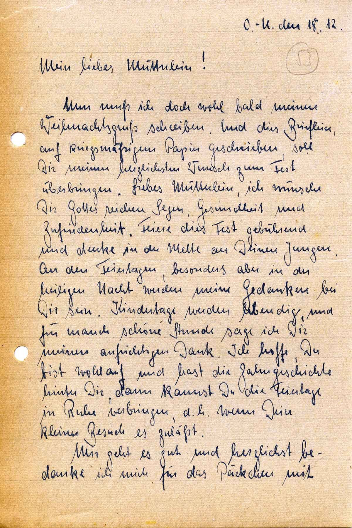 Nun muß ich doch wohl bald meinen Weihnachtsgruß schreiben. Und dies Brieflein, auf kriegsmäßigem Papier geschrieben, soll Dir meinen herzlichsten Wunsch zum Fest überbringen. Liebes Mütterlein, ich wünsche Dir Gottes reichen Segen, Gesundheit und Zufriedenheit. Feiere dies Fest gebührend und denke in der Mette an Deinen Jungen. An den Feiertagen, besonders aber in der heiligen Nacht werden meine Gedanken bei Dir sein. Kindertage werden lebendig, und für manch schöne Stunde sage ich Dir meinen aufrichtigen Dank. Ich hoffe, Du bist wohlauf und hast die Zahngeschichte hinter Dir, dann kannst Du die Feiertage in Ruhe verbringen, d. h. wenn Dein kleiner Besuch es zuläßt.