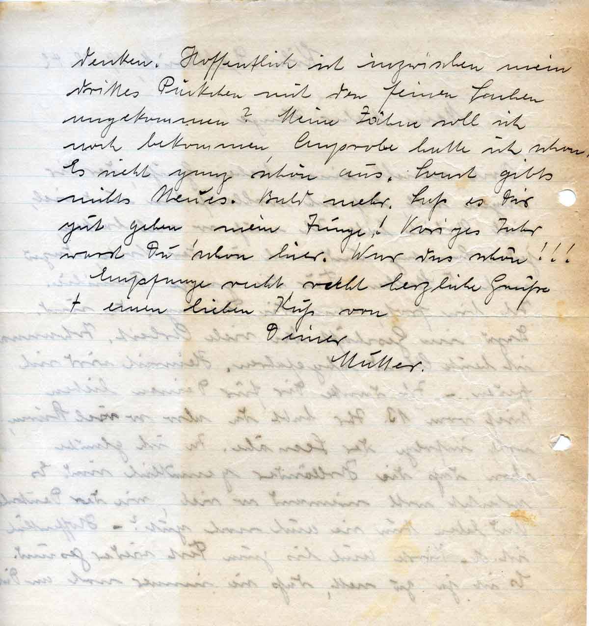 denken. Hoffentlich ist inzwischen mein drittes Päckchen mit den feinen Sachen angekommen? Meine Zähne soll ich noch bekommen, Anprobe hatte ich schon. Es sieht ganz schön aus. Sonst gibt’s nichts Neues. Bald mehr. Laß es Dir gut gehen, mein Junge! Voriges Jahr warst Du schon hier. War das schön!!!