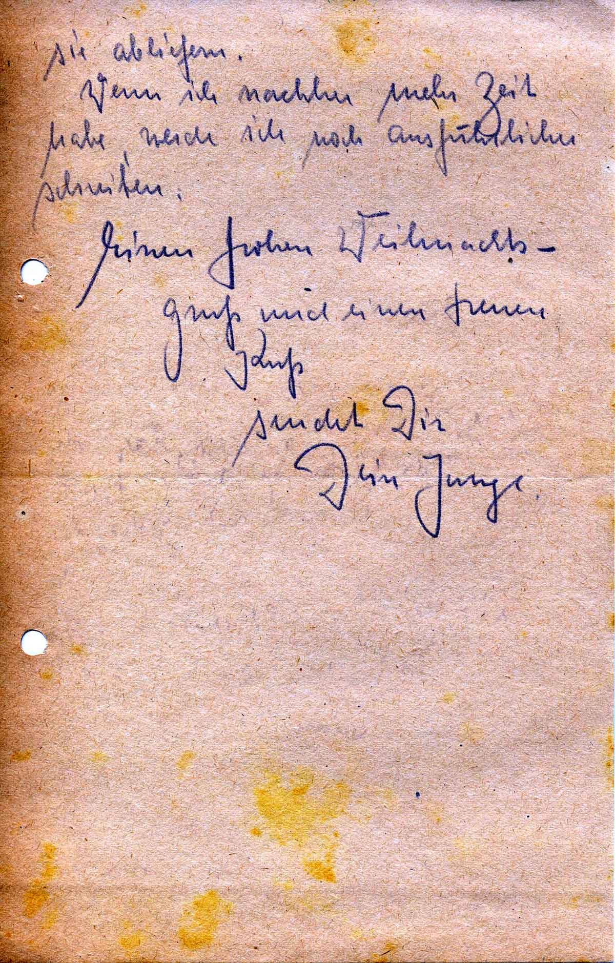 Wir werden, wenn wir Ruhe haben, an den Feiertagen gut leben, ich habe so allerlei für die Einheit besorgen können. Eine schöne Sache für Dich habe ich noch hier, ich bin zu ängstlich sie zu schicken, ich bring sie mit oder aber ein Urlauber, der nach Köln fährt, wird