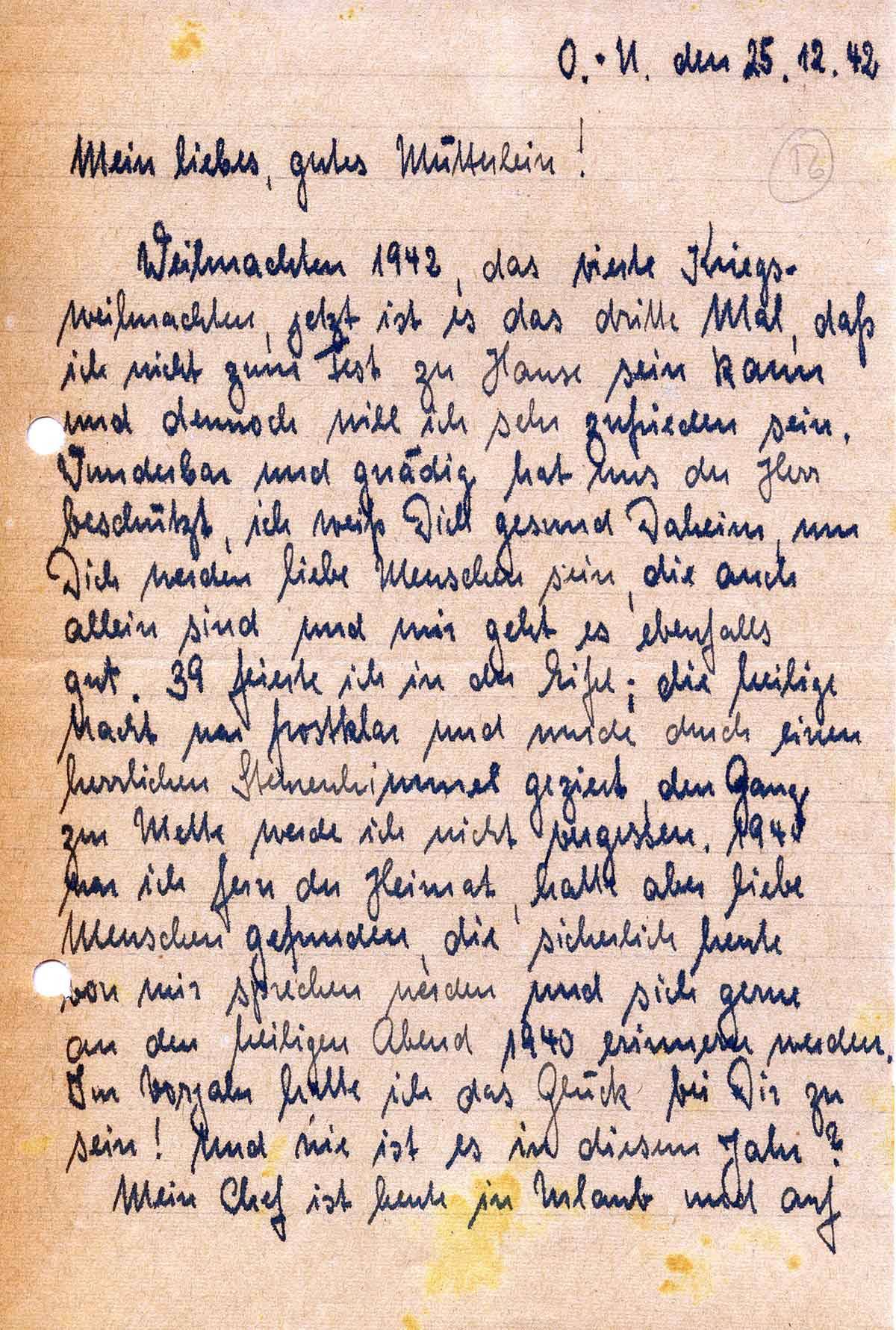 Weihnachten 1942, das vierte Kriegsweihnachten, jetzt ist es das dritte Mal, daß ich nicht zum Fest zu Hause sein kann und dennoch will ich sehr zufrieden sein. Wunderbar und gnädig hat uns der Herr beschützt, ich weiß Dich gesund Daheim, um Dich werden liebe Menschen sein, die auch allein sind und mir geht es ebenfalls gut. 39 feierte ich in der Eifel; die heilige Nacht war frostklar und wurde durch einen herrlichen Sternenhimmel geziert, den Gang zur Mette werde ich nicht vergessen. 1940 war ich fern der Heimat, hatte aber liebe Menschen gefunden, die sicherlich heute von mir sprechen werden und sich gerne an den heiligen Abend 1940 erinnern werden. Im Vorjahr hatte ich das Glück bei Dir zu sein! Und wie ist es in diesem Jahr?