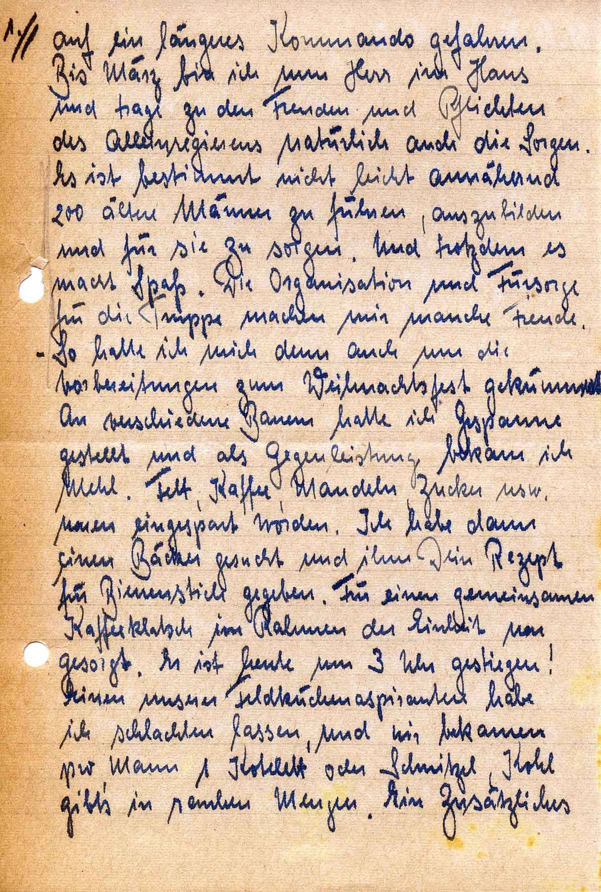 auf ein längeres Kommando gefahren. Bis März bin ich nun Herr im Haus und trage zu den Freuden und Pflichten des Alleinregierens natürlich auch die Sorgen. Es ist bestimmt nicht leicht annähernd 200 ältere Männer zu führen, auszubilden und für sie zu sorgen. Und trotzdem es macht Spaß. Die Organisation und Fürsorge für die Truppe macht mir manche Freude. So hatte ich mich denn auch um die Vorbereitungen zum Weihnachtsfest gekümmert. An verschiedene Bauern hatte ich Gespanne gestellt und als Gegenleistung bekam ich Mehl. Fett, Kaffee, Mandeln, Zucker usw. waren eingespart worden. Ich habe dann einen Bäcker gesucht und ihm Dein Rezept für Bienenstich gegeben. Für einen gemeinsamen Kaffeeklatsch im Rahmen der Einheit war gesorgt. Er ist heute um 3 Uhr gestiegen! Einen unserer Feldküchenaspiranten habe ich schlachten lassen, und wir bekamen pro Mann 1 Kotelett oder Schnitzel, Kohl gibt’s in rauhen Mengen. Ein Zusätzliches