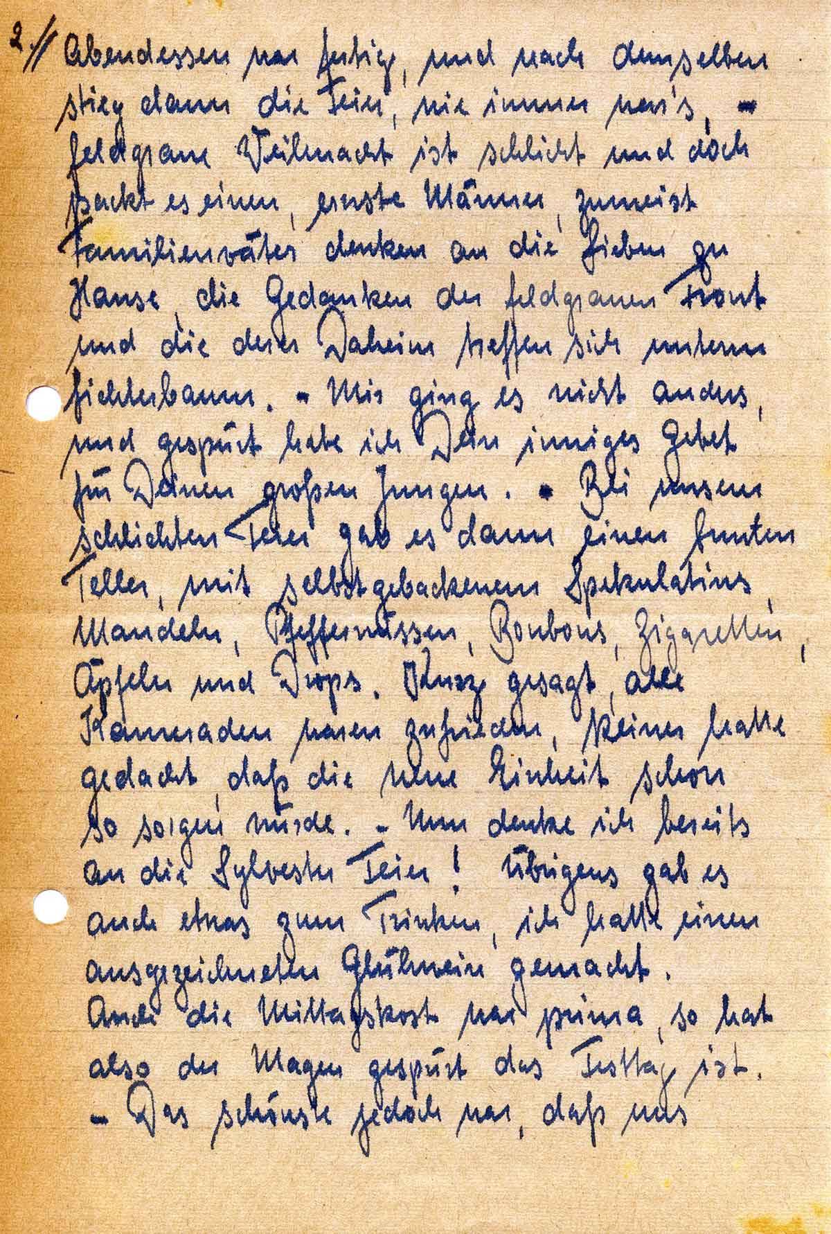 Abendessen war fertig, und nach demselben stieg dann die Feier, wie immer war’s – feldgraue Weihnacht ist schlicht und doch packt es einen, ernste Männer, zumeist Familienväter denken an die Lieben zu Hause, die Gedanken der feldgrauen Front und die derer Daheim treffen sich unterm Lichterbaum. – Mir ging es nicht anders, und gespürt habe ich Dein inniges Gebet für Deinen großen Jungen. – Bei unserer schlichten Feier gab es dann einen bunten Teller, mit selbstgebackenem Spekulatius, Mandeln, Pfeffernüssen, Bonbons, Zigaretten, Äpfeln und Drops. Kurz gesagt, alle Kameraden waren zufrieden, keiner hatte gedacht, daß die neue Einheit schon so sorgen würde. – Nun denke ich bereits an die Sylvester Feier! Übrigens gab es auch etwas zum Trinken, ich hatte einen ausgezeichneten Glühwein gemacht.