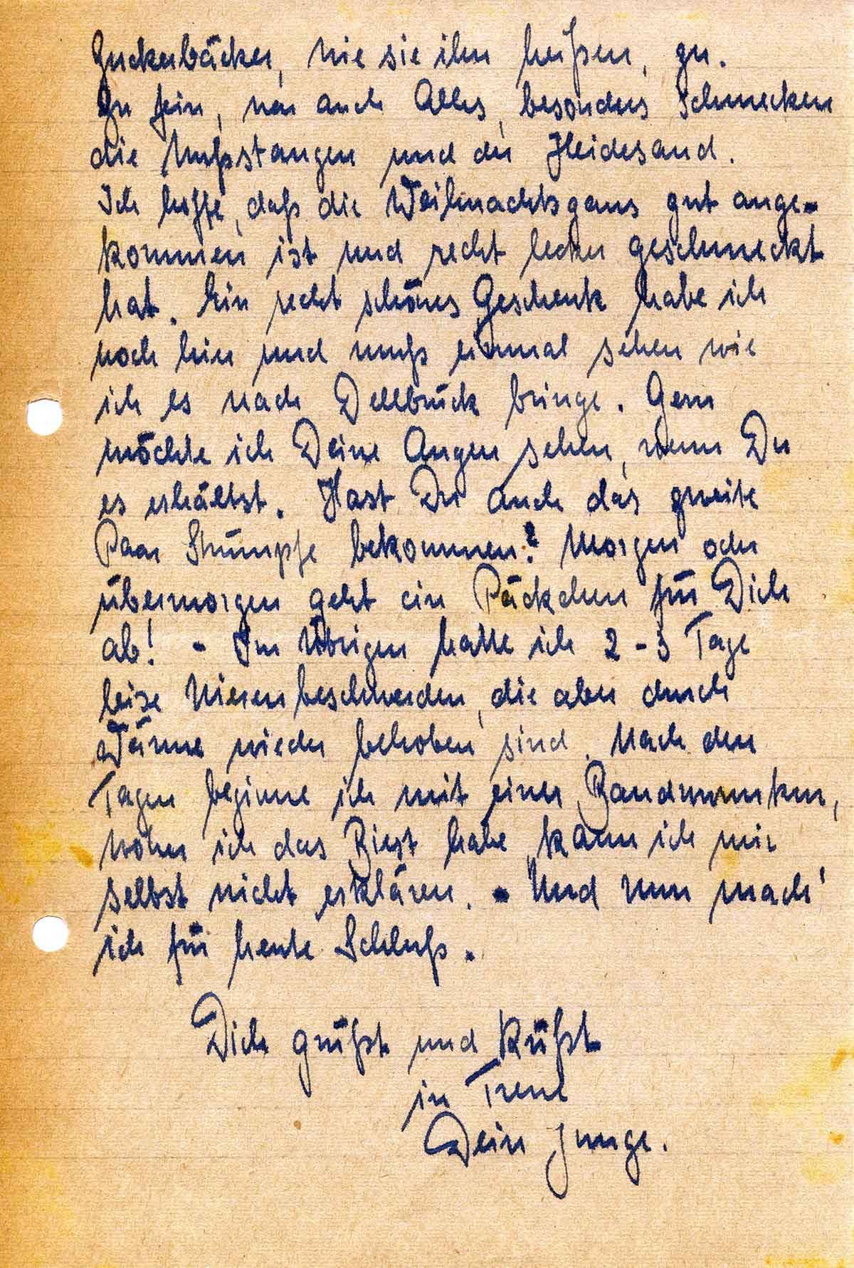 Ich hoffe, daß die Weihnachtsgans gut angekommen ist und recht lecker geschmeckt hat. Ein recht schönes Geschenk habe ich noch hier und muß einmal sehen wie ich es nach Dellbrück bringe. Gern möchte ich Deine Augen sehen, wenn Du es erhältst. Hast Du auch das zweite Paar Strümpfe bekommen? Morgen oder übermorgen geht ein Päckchen für Dich ab! – Im Übrigen hatte ich 2-3 Tage leise Nierenbeschwerden, die aber durch Wärme wieder behoben sind. Nach den Tagen beginne ich mit einer Bandwurmkur, woher ich das Biest habe, kann ich mir selbst nicht erklären. – Und nun mach‘ ich für heute Schluß.
