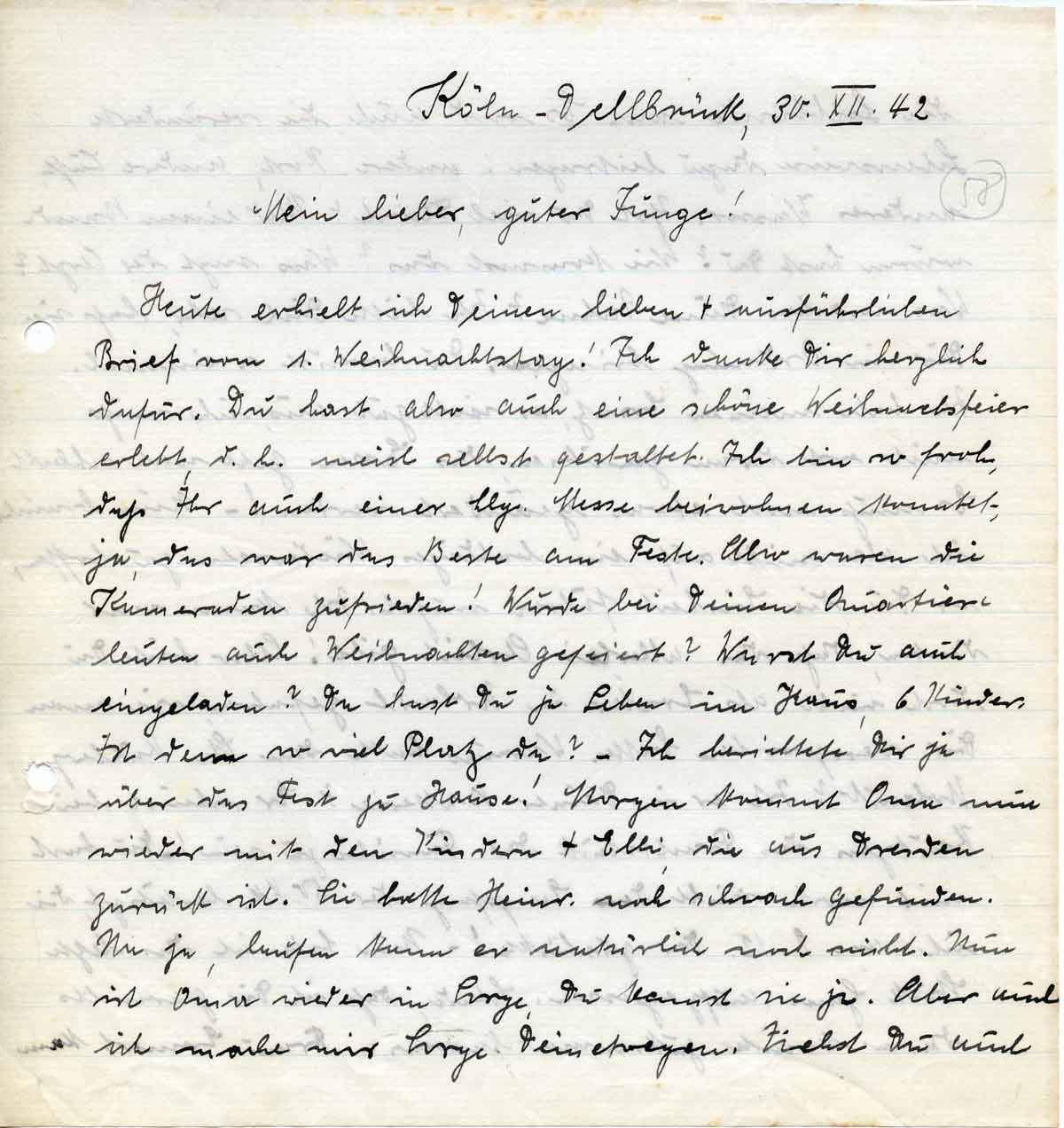 Heute erhielt ich Deinen lieben + ausführlichen Brief vom 1. Weihnachtstag! Ich danke Dir herzlich dafür. Du hast also auch eine schöne Weihnachtsfeier erlebt, d. h. meist selbst gestaltet. Ich bin so froh, daß Ihr auch einer hlg. Messe beiwohnen konntet, ja, das war das Beste am Feste. Also waren die Kameraden zufrieden! Wurde bei Deinen Quartierleuten auch Weihnachten gefeiert? Warst Du auch eingeladen? Da hast Du ja Leben im Haus, 6 Kinder. Ist denn so viel Platz da? – Ich berichtete Dir ja über das Fest zu Hause! Morgen kommt Oma nun wieder mit den Kindern + Elli, die aus Dresden zurück ist. Sie hatte Heinr. noch schwach gefunden. Na ja, laufen kann er natürlich noch nicht. Nun ist Oma wieder in Sorge, Di kennst sie ja. Aber auch ich mache mir Sorge. Deinetwegen. Ziehst Du auch