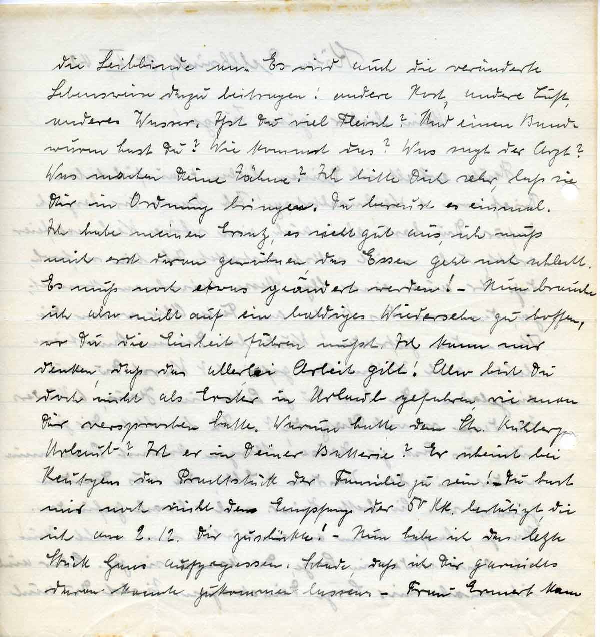 die Leibbinde an. Es wird auch die veränderte Lebensweise dazu beitragen : andere Kost, andere Luft, anderes Wasser. Ißst Du viel Fleisch? Und einen Bandwurm hast Du? Wie kommt das? Was sagt der Arzt? Was machen Deine Zähne? Ich bitte Dich sehr, laß sie Dir in Ordnung bringen. Du bereust es einmal. Ich habe meinen Ersatz, es sieht gut aus, ich muß mich erst daran gewöhnen, das Essen geht noch schlecht. Es muß noch etwas geändert werden! – Nun brauche ich aber nicht auf ein baldiges Wiedersehen zu hoffen, wo Du die Einheit führen mußt. Ich kann mir denken, daß das allerlei Arbeit gibt! Also bist Du doch nicht als Erster in Urlaub gefahren, wie man Dir versprochen hatte. Warum hatte denn Ltn. Kühlberg Urlaub? Ist er in Deiner Batterie? Er scheint bei Reutgens das Prachtstück der Familie zu sein! – Du hast mir noch nicht den Empfang der 50 Rk. bestätigt, die ich am 2.12. Dir zuschickte! – Nun habe ich das letzte Stück Gans aufgegessen. Schade, daß ich Dir garnichts davon konnte zukommen lassen. – Frau Ermert kam