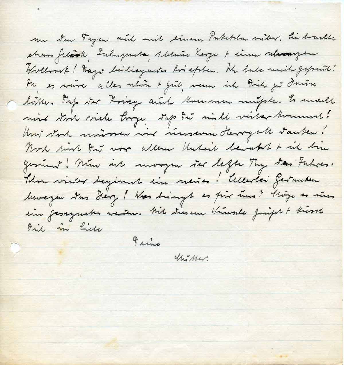 an den Tagen auch mit einem Paketchen rüber. Sie brachte etwas Gebäck, Zahnpasta, 1 blaue Kerze + einen schwarzen Wollrock! Dazu beiliegendes Briefchen. Ich habe mich gefreut! Ja, es wäre alles schön + gut, wenn ich Dich zu Hause hätte. Daß der Krieg auch kommen mußte. Er macht mir doch viele Sorge, daß Du nicht weiterkommst! Und doch müssen wir unserm Herrgott danken! Noch bist Du vor allem Unheil bewahrt + ich bin gesund! Nun ist morgen der letzte Tag des Jahres. Schon wieder beginnt ein neues! Allerlei Gedanken bewegen das Herz! Was bringt es für uns? Möge es uns ein gesegnetes werden. Mit diesem Wunsche grüßt + küsst Dich in Liebe