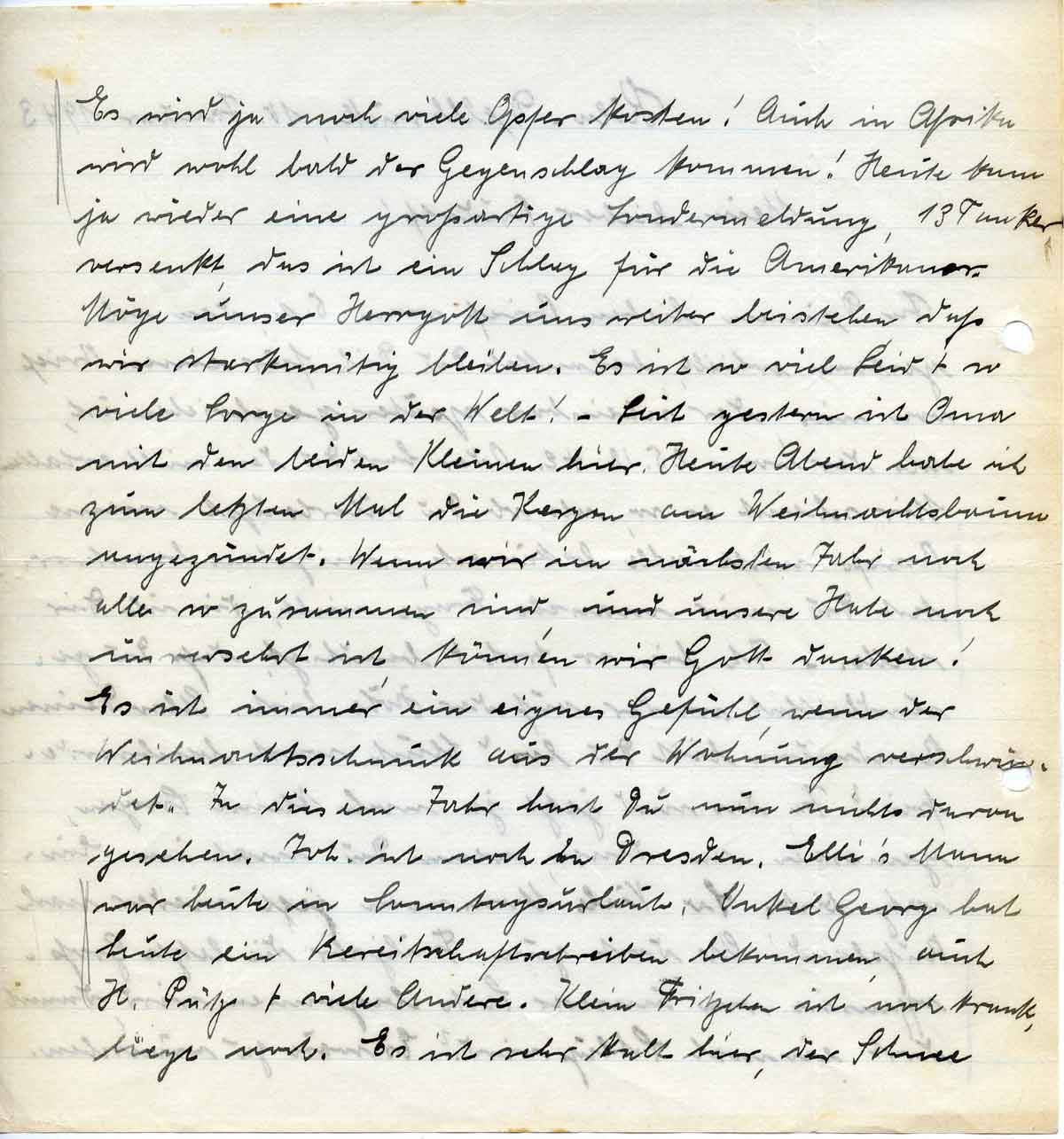 Es wird ja noch viele Opfer kosten! Auch in Afrika wird wohl bald der Gegenschlag kommen! Heute kam ja wieder eine großartige Sondermeldung, 13 Tanker versenkt, das ist ein Schlaf für die Amerikaner. Möge unser Herrgott uns weiter beistehen, daß wir starkmütig bleiben. Es ist so viel Leid + so viele Sorge in der Welt! – Seit gestern ist Oma mit den beiden Kleinen hier. Heute Abend habe ich zum letzten Mal die Kerzen am Weihnachtsbaum angezündet. Wenn wir im nächsten Jahr noch alle so zusammen sind, und unsere Habe noch unversehrt ist, können wir Gott danken! Es ist immer ein eignes Gefühl, wenn der Weihnachtsschmuck aus der Wohnung verschwindet. In diesem Jahr hast Du nun nichts davon gesehen. Joh. ist noch in Dresden. Elli’s Mann war heute in Sonntagsurlaub. Onkel Georg hat heute ein Bereitschaftschreiben bekommen, auch H. Pütz + viele Andere. Klein Fritzchen ist noch krank, liegt noch. Es ist sehr kalt hier, der Schnee