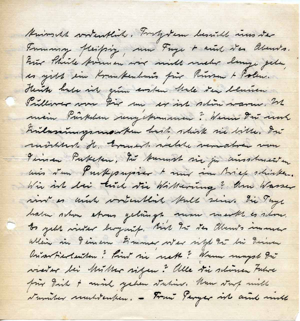 knirscht ordentlich. Trotzdem besucht uns der Tommy fleißig, am Tage + auch des Abends. Zur Schule können wir nicht mehr lange gehen, es gibt ein Krankenhaus für Russen + Polen. Heute habe ich zum ersten Male den blauen Pullover von Dir an, er ist schön warm. Ist mein Päckchen angekommen? Wenn Du noch Zulassungsmarken hast, schick sie bitte. Du möchtest H. Ermert welche verwahren von Deinen Paketen. Du kannst sie ja ausschneiden aus den Packpapier +mir im Brief schicken. Wie ist bei Euch die Witterung? Am Wasser wird es auch ordentlich kalt sein. Die Tage haben schon etwas gelängt, man merkt es schon. Es geht wieder bergauf. Bist Du des Abends immer allein in Deinem Zimmer, oder sitzt Du bei Deinen Quartierleuten? Sind sie nett? Wann magst Du wieder bei Mutter sitzen? Alle die schönen Jahre für Dich + mich gehen dahin. Man darf nicht darüber nachdenken. – Frau Perger ist auch nicht