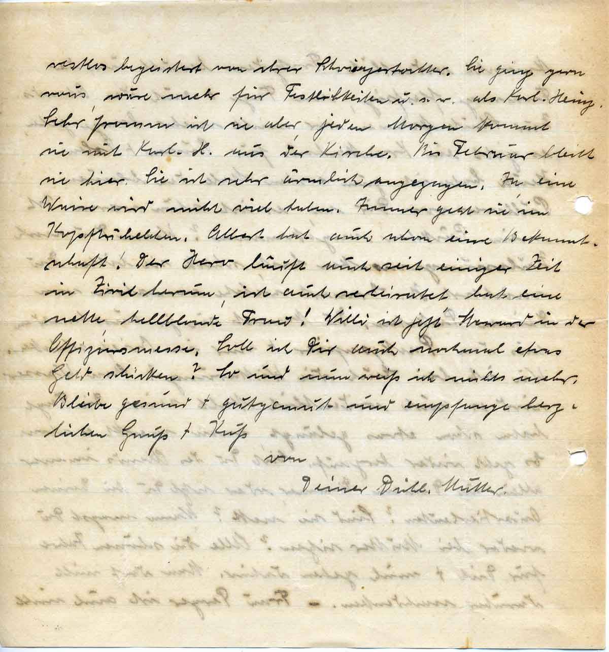 restlos begeistert von ihrer Schwiegertochter. Sie ging gern raus, wäre mehr für Festlichkeiten u.s.w. als Karl-Heinz. Sehr fromm ist sie aber, jeden Morgen kommt sie mit Karl-H. aus der Kirche. Bis Februar bleibt sie hier. Sie ist sehr ärmlich angezogen. Ja, eine Waise wird nicht viel haben. Immer geht sie im Kopftüchelchen. Albert hat auch schon eine Bekanntschaft! Der Herr läuft auch seit einiger Zeit in Zivil herum, ist auch verheiratet, hat eine nette, hellblonde Frau! Willi ist jetzt Steward in der Offiziersmesse. Soll ich Dir auch nochmal etwas Geld schicken? So und nun weiß ich nichts mehr. Bleibe gesund + gutgelaunt und empfange herzlichen Gruß + Kuß