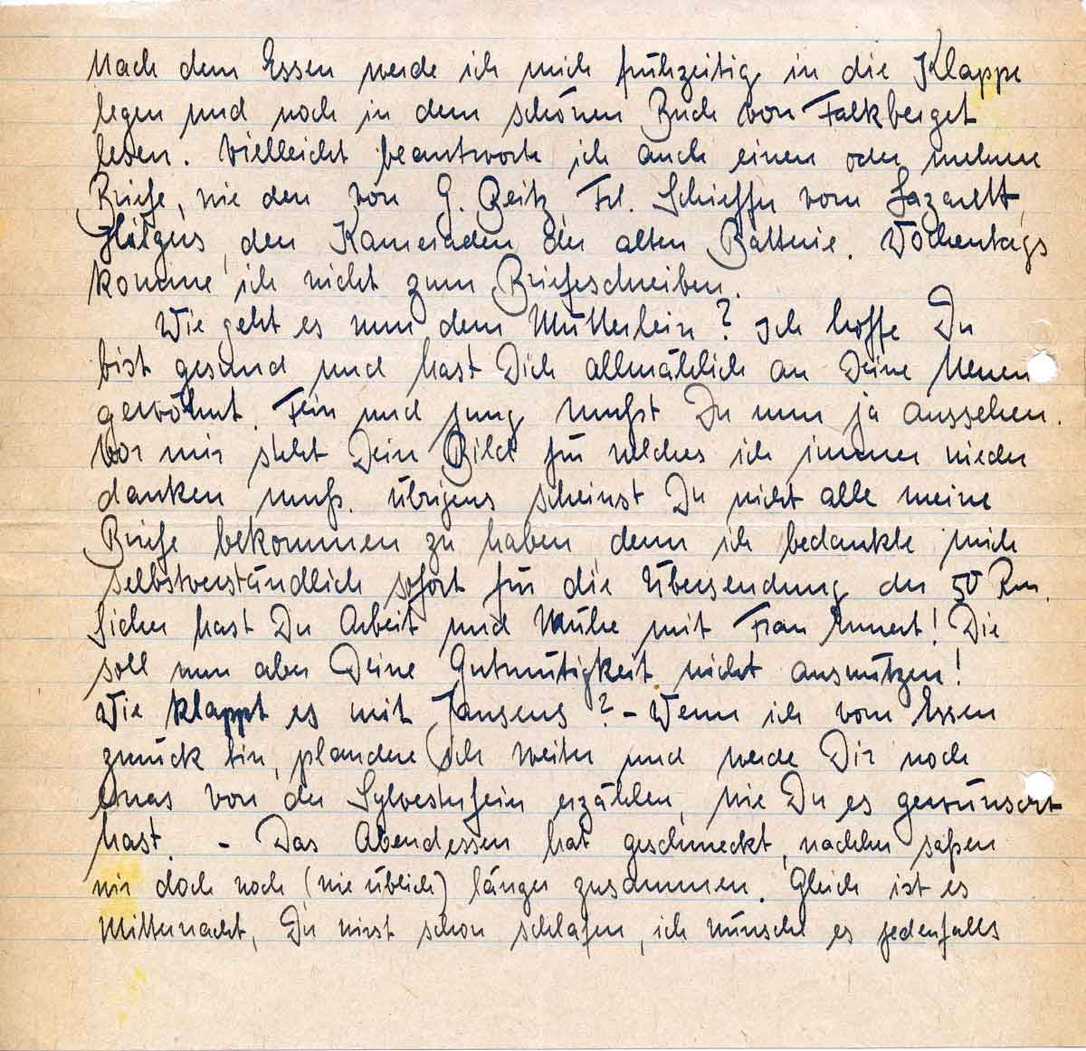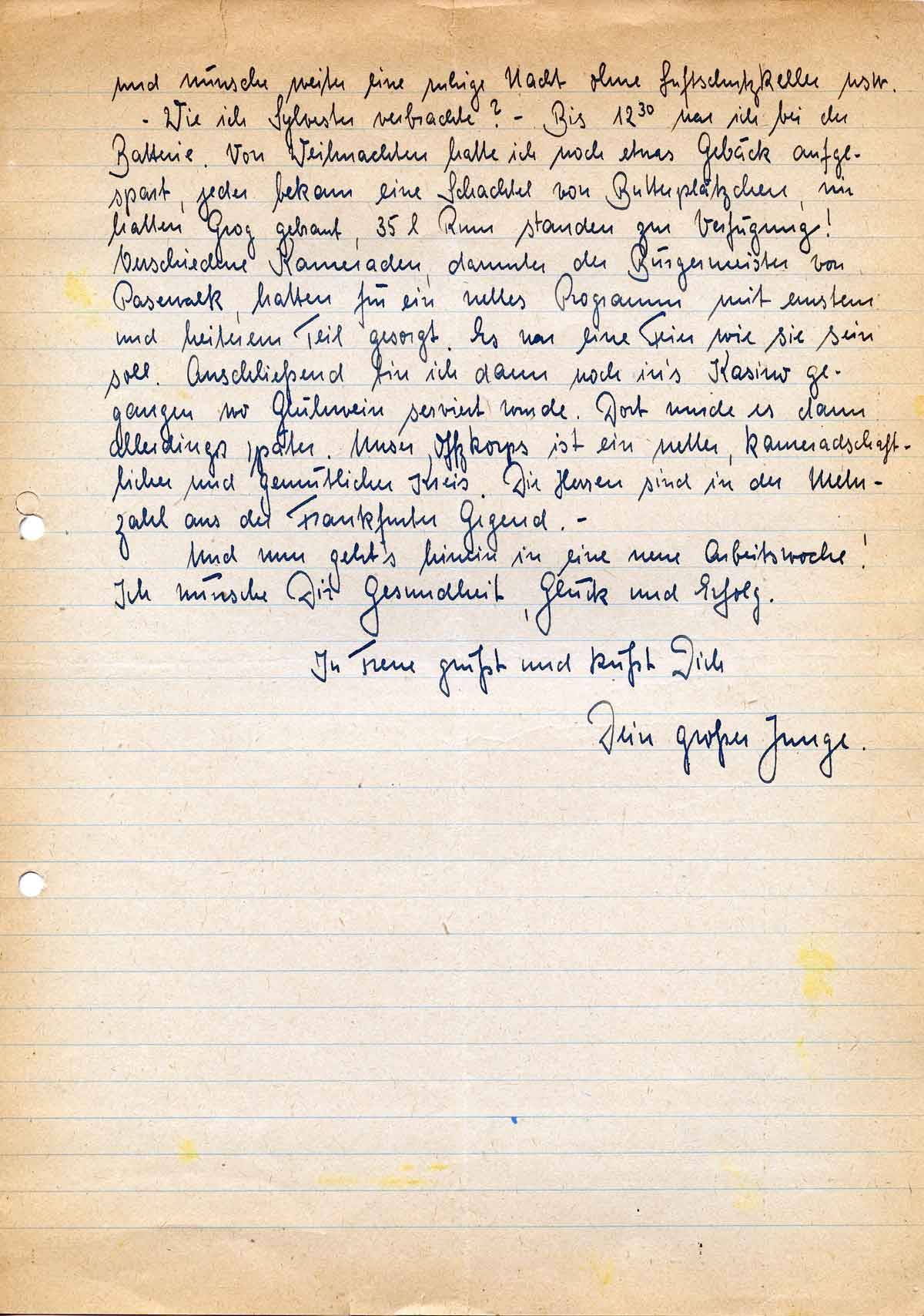 Wie geht es nun dem Mütterlein? Ich hoffe Du bist gesund und hast Dich allmählich an Deine Neuen gewöhnt. Fein und jung mußt Du nun ja aussehen. Vor mir steht Dein Bild für welches ich immer wieder danken muß. Übrigens scheinst Du nicht alle meine Briefe bekommen zu haben, denn ich bedankte mich selbstverständlich sofort für die Übersendung der 50 Rm. Sicher hast Du Arbeit und Mühe mit Frau Ermert! Die soll nun aber Deine Gutmütigkeit nicht ausnützen! Wir klappt es mit Jansens? – Wenn ich vom Essen zurück bin, plaudere ich weiter und werde Dir noch etwas von der Sylvesterfeier erzählen, wie Du es gewünscht hast. – Das Abendessen hat geschmeckt, nachher saßen wir doch noch (wie üblich) länger zusammen. Gleich ist es Mitternacht, Du wirst schon schlafen, ich wünsche es jedenfalls