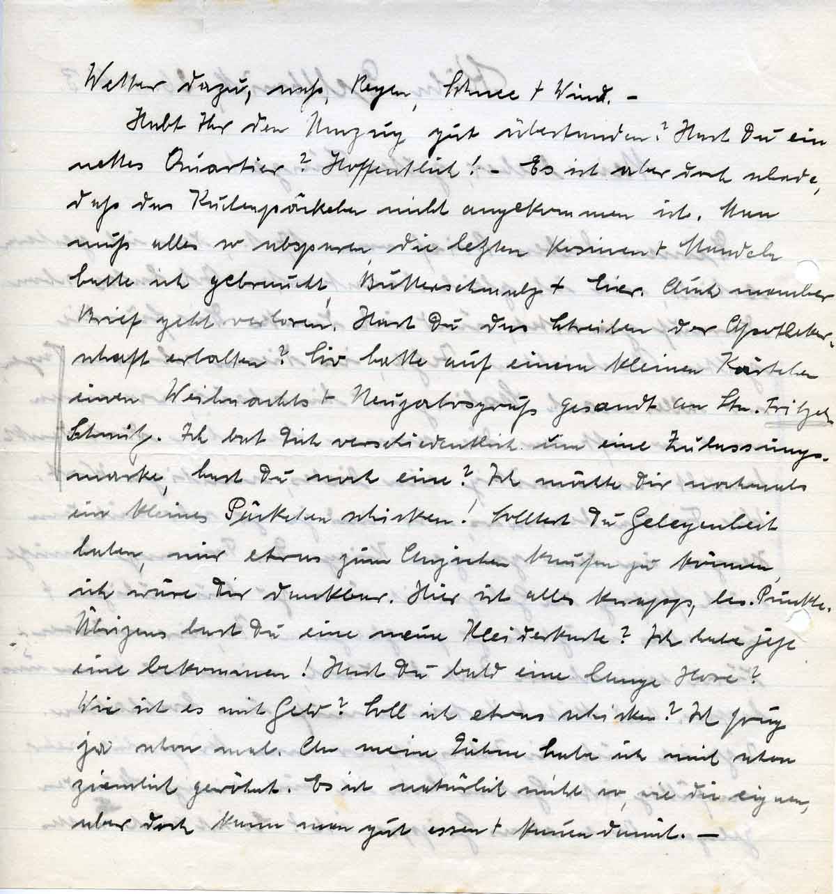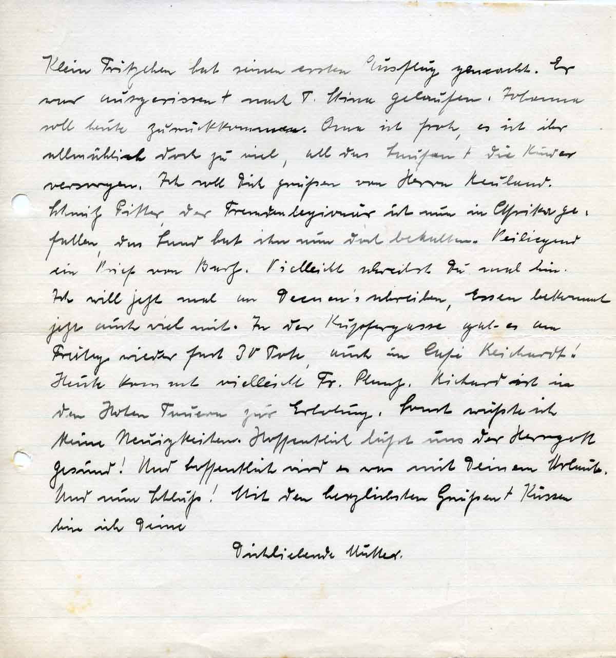 Klein Fritzchen hat seinen ersten Ausflug gemacht. Er war ausgerissen + nach T. Stina gelaufen. Johanna soll heute zurückkommen. Oma ist froh, es ist ihr allmählich doch zu viel, all das Laufen + die Kinder versorgen. Ich soll Dich grüßen von Herrn Reuland. Schmitz Pitter, der Fremdenlegionär ist nun in Afrika gefallen, das Land hat ihn nun doch behalten. Beiliegend ein Brief von Bartz. Vielleicht schreibst Du mal hin. Ich will jetzt mal an Deenen’s schreiben, Essen bekommt jetzt auch viel mit. In der Kupfergasse gab es am Freitag wieder fast 30 Tote, auch im Café Reichardt! Heute kommt vielleicht Fr. Plantz. Richard ist in den Hohen Tauern zur Erholung. Sonst wüßte ich keine Neuigkeiten. Hoffentlich läßt uns der Herrgott gesund! Und hoffentlich wird es was mit Deinem Urlaub.